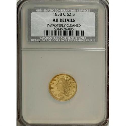 <B>1838-C $2 1/2 --Improperly Cleaned--NCS. AU Details.</B></I> Only a single die pair is known for this difficult introductory Charlotte issue. This is unsurprising given the tiny emission of 7,880 pieces, the lowest in the Classic quarter eagle series. This crisply struck example has little actual wear, but the fields are cloudy from hairlines.<BR><BR><B>Coin Engraver:</B> William Kneass<BR><BR><b>Shipping:</b> Coins & Currency (<a target="_blank" href="http://www.heritageauctions.com/common/shipping.php">view shipping information</a>)