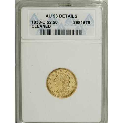 <B>1838-C $2 1/2 --Cleaned--ANACS. AU53 Details.</B></I> Variety 1-A, the only known die pairing. Douglas Winter (1998) indicates that the 1838-C is usually seen in Very Fine and Extremely Fine grades, and is rare in About Uncirculated and very rare in Mint State. Bright yellow-gold surfaces of this AU53 Details example display better-than-average definition on the design features. Fine hairlines are scattered over both sides, but this light cleaning should not dissuade prospective bidders.<BR><BR><b>Shipping:</b> Coins & Currency (<a target="_blank" href="http://www.heritageauctions.com/common/shipping.php">view shipping information</a>)