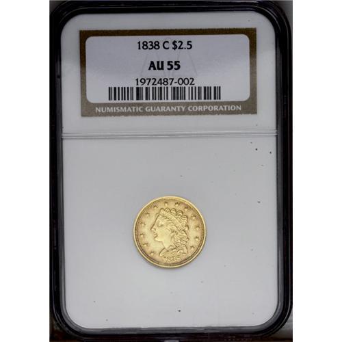 <B>1838-C<$2 1/2> AU55 NGC.</B></I> Variety 1-A. The premier quarter eagle from the Charlotte Mint and an especially sought-after issue from a small mintage of just 7,880 coins. As with all 1838-Cs, the mintmark is widely double punched below the portrait, first entered low enough to touch the top of the 3 in the date. While displaying occasional bluntness on the highpoints (particularly on the eagle's right wingtip), this still-lustrous example is accented in attractive copper-gold hues. A pair of die cracks about the eagle indicates a late state of the dies. Census: 14 in 55, 31 finer (3/06). <BR><BR><B>Important notice:</B> Heritage usually auctions material at the rate of 200-250 lots per hour. On some occasions eBay Live bid software or the Internet may not be able to keep up with the pace of the auction. We recommend placing a realistic absentee bid now as insurance to avoid disappointment. Occasionally the auctioneer may eliminate or reject an eBay Live bid, and the auctioneer may also reopen a lot after the close of the eBay live bidding (usually because we missed an audience bid), and may reject your bid even if it shows you as the winning bidder. By bidding via eBay Live, you agree that Heritage may award the lot to another bidder at its sole discretion under the circumstances described above or any other reasonable circumstances. Since eBay bids are not shown to us until we open the lot on the floor, we treat those bids just like floor bids. In most cases the floor responds before the eBay bid is presented to us, due to Internet lag time, so for consistency we have made it a policy that floor bids are always considered first over tie eBay live bids. Also please note that all Heritage lots purchased through eBay Live carry a 20% Buyer's Premium. Please make sure you read the Terms and Conditions before you bid. This lot is being auctioned in conjunction with a live floor auction by Heritage Galleries & Auctioneers. All final auction and invoice information will be supplied by Heritage Galleries & Auctioneers, and all other information should be considered preliminary. Lot:2346 <BR><BR><B>Winning Notification and Billing:</B> After the FINAL session in this auction is complete, Heritage will send e-mail and snail mail invoices. This process normally takes several days. All final auction and invoice information will be supplied by Heritage Galleries & Auctioneers, and all other information should be considered preliminary. <BR><BR>This auction will be conducted on a live auction floor and over the Internet through eBay Live. If you choose to place an absentee bid, please take a moment to <font color='#0000ff'><u><a href='http://pages.ebay.com/liveauctions/help/before/laabsentee.html'>learn how eBay Live absentee bidding works</a></u></font><font color='#000000'>