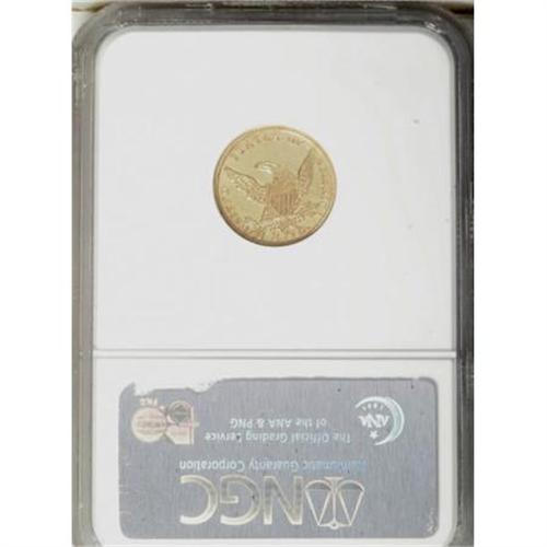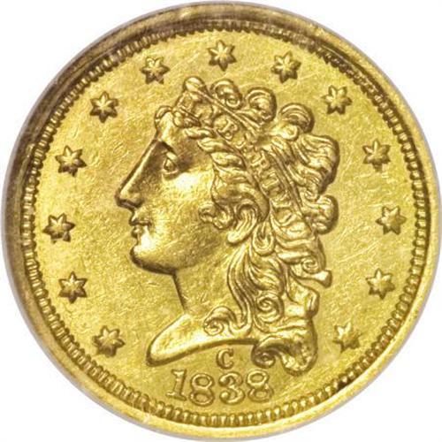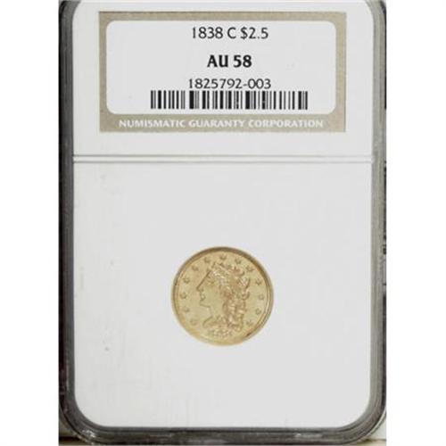 <B>1838-C $2 1/2 AU58 NGC.</B></I> Variety 1-A, R.3, the only known die pair. The 1838-C quarter eagle is an extremely popular coin among early gold enthusiasts. It is a first-year-of-issue and one of just two Charlotte quarter eagles that use the Classic Head, obverse mintmark design. All known examples exhibit a repunched mintmark, that was initially entered too low.<BR> Writing in his Charlotte Mint gold coins reference (1998), Doug Winter says the 1838-C quarter eagle "... is rare in About Uncirculated and very rare in Uncirculated." The population reports bear this out, even though the NGC/PCGS population distribution peaks in the better grades of About Uncirculated (AU55 and AU58). This skewing of the population data undoubtedly results from repeated resubmissions in an attempt to attain Mint State grades.<BR> This near-Mint example displays excellent definition on the design features. Liberty's hair is particularly sharp, as is the eagle's plumage, save for the upper parts of the left (right facing) wing. The surfaces are a bright yellow-gold, and retain traces of luster in the recesses. A few marks are noted on the obverse, but all in all, the coin fares better than most examples of the issue, of which Winter contends: "Nearly all 1838-C quarter eagles have very scruffy surfaces. The fields often show numerous digs and scratches."<BR><BR><B>Coin Engraver:</B> William Kneass<BR><BR><b>Shipping:</b> Coins & Currency (<a target="_blank" href="http://www.heritageauctions.com/common/shipping.php">view shipping information</a>)