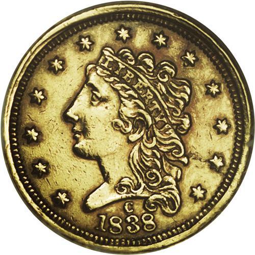 <B>1838-C $2 1/2 --Cleaned--ANACS. AU50 Details.</B></I> Breen-6147, R.3. A splendidly detailed rare date quarter eagle with bright and glossy fields. A minor scrape is noted left of star 12, and a thin vertical mark crosses Liberty's neck. The 1838-C has a mintage of just 7,880 pieces, the lowest production of the Classic type.<BR><BR><b>Shipping:</b> Coin/Currency (<a target="_blank" href="http://www.heritageauctions.com/common/shipping.php">view shipping information</a>)