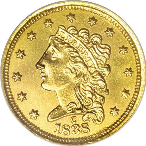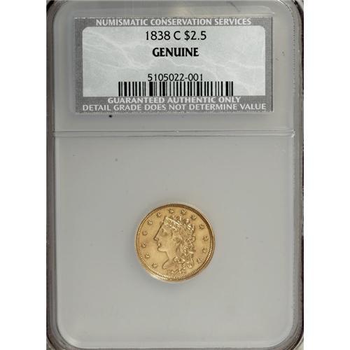 <B>1838-C $2 1/2 --Genuine--NCS.</B></I> MS60 Details, Cleaned. Variety 1-A. This is the only die pairing used for the coinage of 1838-C quarter eagles. The reverse die carried over for use in 1839, the only other issue of the Classic Head design from Charlotte. Struck nearly 170 years ago, this and the half eagle were the first gold coinage issues of the Charlotte Mint. Both sides are sharply detailed with bright yellow-gold surfaces resulting from light cleaning, although traces of original luster remain.<BR><BR><b>Shipping:</b> Coins & Currency (<a target="_blank" href="http://www.heritageauctions.com/common/shipping.php">view shipping information</a>)