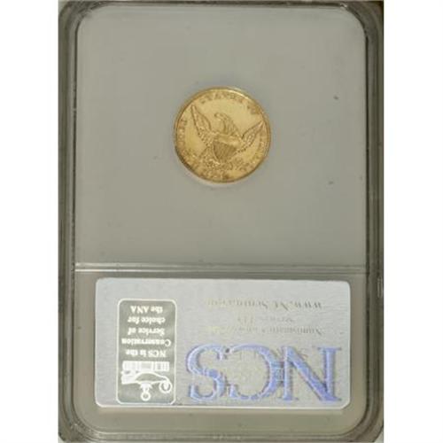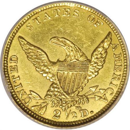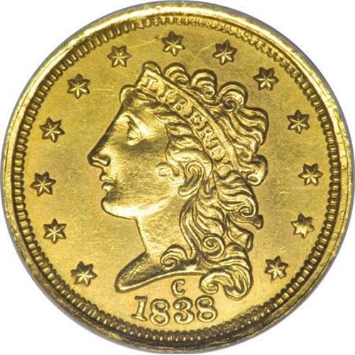 <B>1838-C $2 1/2 --Improperly Cleaned--NCS. Unc Details.</B></I> Variety 1-A, R.3. One die pair was used to strike the 1838-C. It has the lowest mintage of the type (7,880 pieces), and is the only Classic Head quarter eagle with fewer than 10,000 coins struck. Mint State examples are extremely rare, as evidenced by only 15 Uncirculated coins seen by NGC and PCGS. The bright yellow-gold surfaces of this Unc Details specimen have not suffered that much from a light cleaning. They are free of significant contact marks, and exhibit sharply struck design elements. The usual doubling is seen on the mintmark.<BR><BR><B>Coin Engraver:</B> William Kneass<BR><BR><b>Shipping:</b> Coins & Currency (<a target="_blank" href="http://www.heritageauctions.com/common/shipping.php">view shipping information</a>)