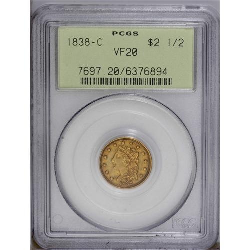 <B>1838-C<$2 1/2> VF20 PCGS.</B></I> Variety 1-A. Only one die pair was used to strike the 1838-C, and it is noteworthy for the obverse mintmark widely repunched south. Sharper than expected for the grade, although the reddish-gold surfaces are lightly hairlined.<BR><I>From The Steve Glenn Collection.</B></I> <BR><BR><B>Important notice:</B> Heritage usually auctions material at the rate of 200-250 lots per hour. On some occasions eBay Live bid software or the Internet may not be able to keep up with the pace of the auction. We recommend placing a realistic absentee bid now as insurance to avoid disappointment. Occasionally the auctioneer may eliminate or reject an eBay Live bid, and the auctioneer may also reopen a lot after the close of the eBay live bidding (usually because we missed an audience bid), and may reject your bid even if it shows you as the winning bidder. By bidding via eBay Live, you agree that Heritage may award the lot to another bidder at its sole discretion under the circumstances described above or any other reasonable circumstances. Since eBay bids are not shown to us until we open the lot on the floor, we treat those bids just like floor bids. In most cases the floor responds before the eBay bid is presented to us, due to Internet lag time, so for consistency we have made it a policy that floor bids are always considered first over tie eBay live bids. Also please note that all Heritage lots purchased through eBay Live carry a 20% Buyer's Premium. Please make sure you read the Terms and Conditions before you bid. This lot is being auctioned in conjunction with a live floor auction by Heritage Galleries & Auctioneers. All final auction and invoice information will be supplied by Heritage Galleries & Auctioneers, and all other information should be considered preliminary. Lot:2345 <BR><BR><B>Winning Notification and Billing:</B> After the FINAL session in this auction is complete, Heritage will send e-mail and snail mail invoices. This process normally takes several days. All final auction and invoice information will be supplied by Heritage Galleries & Auctioneers, and all other information should be considered preliminary. <BR><BR>This auction will be conducted on a live auction floor and over the Internet through eBay Live. If you choose to place an absentee bid, please take a moment to <font color='#0000ff'><u><a href='http://pages.ebay.com/liveauctions/help/before/laabsentee.html'>learn how eBay Live absentee bidding works</a></u></font><font color='#000000'>