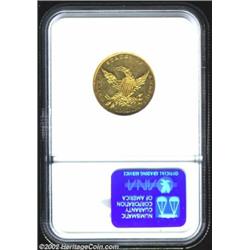 1838-C $5 AU58 NGC. Ex: Bass. Normal 5. McCloskey 1-A, R.5. This variety is distinguished as having a normal 5 in the denomination and two leaves below U. This bright, lustrous coin was ably described in the Bass II catalog as, " Very light yellow gold with minor obverse and reverse abrasions as expected. A sharply struck impression. This is the more common of two varieties and a lovely example at that. Probably one of the five or six finest existing 1838-C half eagles...The present 1838-C stands tall and proud as the finest specimen Harry Bass was able to find of this date, mint, and die variety...A numismatic treasure." Population: 1 in 58, 1 finer (10/02).Ex: Gilhousen Collection (Superior, 2/73), lot 368; Bass II (Bowers and Merena, 10/99), lot 868, where it brought an astonishing $19,550.From the Ashland City Collection. Important notice: We expect to be auctioning lots at the rate of 200-250 per hour. Sometimes eBay Premier live bid software cannot keep up with that pace, so we strongly recommend that you place a realistic proxy bid now as insurance to avoid disappointment. Also please note that all Heritage/CAA lots purchased through eBay Premier carry a 20% Buyer's Premium. Please make sure you read the Terms and Conditions.