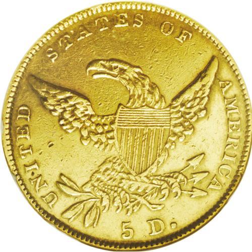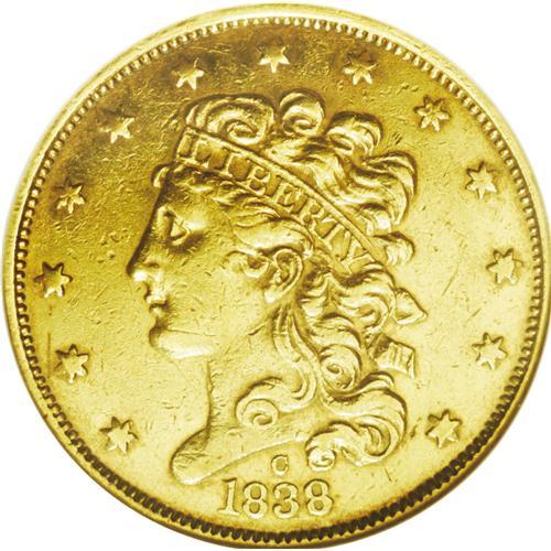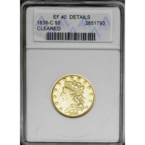 <B>1838-C<$5>--Cleaned--ANACS. XF40 Details.</B></I> Normal 5. McCloskey 1-A, R.4. This variety is easily distinguished as having two leaves below the U in UNITED and a normal 5 in the denomination. The abnormally bright surfaces have obviously been cleaned, however, good detail remains. A few small field marks are noted on this popular, first-year C-mint half eagle.