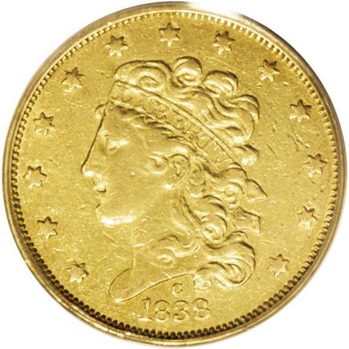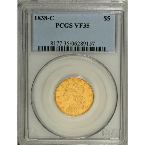 <B>1838-C $5 VF35 PCGS.</B></I> Breen-6517, Normal 5, Variety 1-A, R.4. The lowest mintage of the Classic Head half eagle series, at 17,179 pieces, and a popular piece with its obverse mintmark for the initial year of the Charlotte Mint. The present example shows myriad small abrasions covering each side, with yellow-gold color. Still attractive, despite the wear and contact marks. Population: 17 in 35, 53 finer (12/06).<BR><BR><b>Shipping:</b> Coin/Currency (<a target="_blank" href="http://www.heritageauctions.com/common/shipping.php">view shipping information</a>)