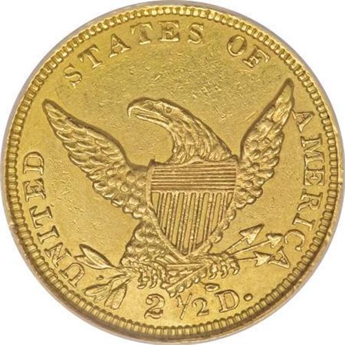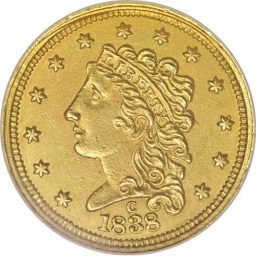 <B>1838-C $2 1/2 --Genuine--NCS.</B></I> Variety 1-A. This is an ungraded coin that we grade MS60 Details, incorrectly certified by NCS as a 1938-C! The C mintmark is boldly repunched, as always, and the yellow-orange surfaces show little in the way of distraction save for a couple of minor abrasions through the last two digits of the date. A few scattered ticks fleck the surfaces, but the strike is generous and much appeal remains.<BR><BR><B>Coin Engraver:</B> William Kneass<BR><BR><b>Shipping:</b> Coins & Currency (<a target="_blank" href="http://www.heritageauctions.com/common/shipping.php">view shipping information</a>)