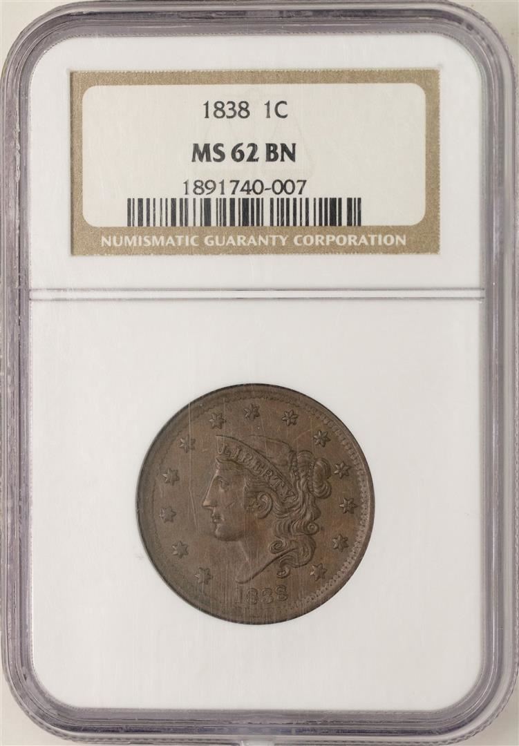 One 1838 Coronet Hair Large Cent Coin NGC MS62BN. NGC Certified.