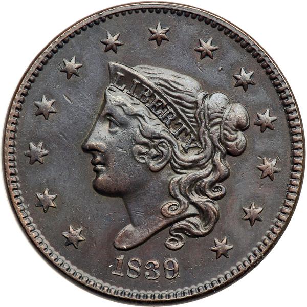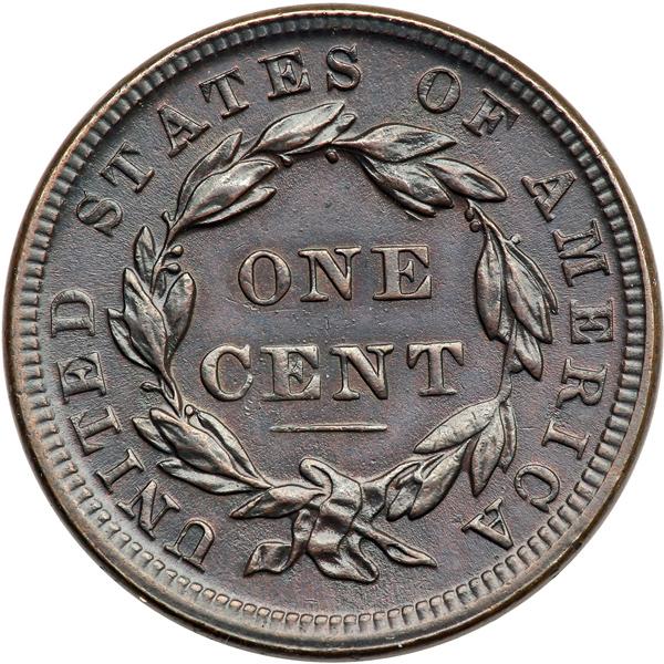 1838 Coronet Head Cent. PCGS graded AU-53. Beautiful glossy olive and chocolate brown. The obverse fields are smooth and slightly reflective while the reverse is frosty thanks to the previously-used reverse die employed to make this variety. There is some microscopic roughness at the leaves under OF and the only notable contact mark is a tiny pinprick in the field left of star 9. EDS but not quite the earliest with smooth, slightly reflective obverse fields and an extremely faint wave in the field below star 4. There is no hint of a die crack in this area. Outstanding sharpness and eye appeal, although it may have been lightly cleaned and expertly retoned long ago. The overdate feature is bold. Called AU50 net EF45 and tied for CC#4 in the Bland census. Noyes photo numbers 24152 and 38359 (a double listing in his census where he reports the coin’s sharpness as EF40 and EF45 respectively and tied for CC#9). A sharp, very attractive example of this popular overdate variety. Our grade is EF45. Pop 1; 1 in 55; 1 in 58; 1 in 65. Only 5 graded at PCGS for the variety. DWH #3176 (PCGS # 37216) .