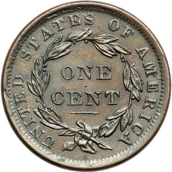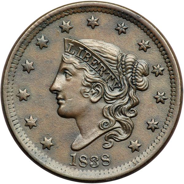 1838 Coronet Head Cent. PCGS graded MS-62 Brown. Attractive glossy steel brown and chocolate with frosty olive brown toning in protected areas. The fields are satiny and lustrous, free of any notable defects other than a very tiny nick just right of the upper lip and several tiny planchet flakes in the reverse dentils. E-MDS. A die crack from the dentils over the left edge of the E in AMERICA forks before reaching the right upright of the M, and then passes through the M just reaching the left foot of the adjacent A but not extending into the field left of that A. The area between the forks of the crack right of the M is sunken. Removed from an NGC slab graded MS62BN (NGC label included, and it shows the attribution and Reiver provenance). Our grade is AU55. Pop 1; 4 finer for the variety at PCGS in Brown at PCGS. There is a single MS65RB graded at PCGS. DWH #2956 (PCGS # 37207) .