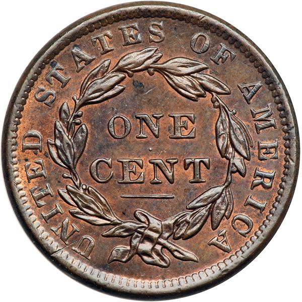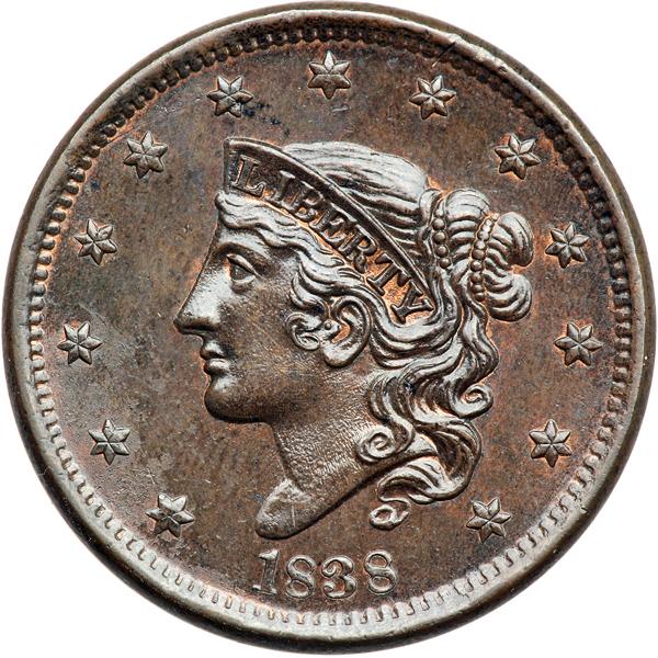 1838 Coronet Head Cent. PCGS graded MS-63 Brown. Glossy chocolate and steel brown with 5% of the red remaining on the obverse, 20% on the reverse. Both sides are coated with a thin layer of lacquer or a similar protectant that imparts a high gloss. (This coating could be removed, if desired.) There are traces of an old fingerprint in the field under the chin, a few tiny specks of darker toning right of star 6, and another at the dentils over the first T in STATES. E-MDS with smooth, slightly reflective fields, especially on the reverse, and a clear die line from the dentils at star 5 to star 6. Called MS60 net AU55 in the Noyes census, his photo #36779. Our grade is MS60. Pop 1; 1 in 64 BN; 1 in 65 BN. Only 3 graded at PCGS for the variety. DWH #1682 (PCGS # 37201) .