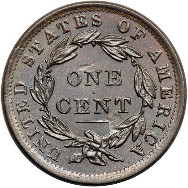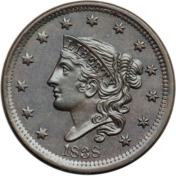 1838 Coronet Head Cent. PCGS graded MS-63 Brown. Glossy dark steel brown and chocolate with delicate hints of bluish steel overtone. The obverse fields are smooth and very slightly reflective while the reverse fields are satiny and covered with frosty luster. No spots or stains, and the only contact mark is a tiny pinprick under the right foot of the second T in STATES. The best identifying defects are shallow low spots (caused by debris on the die) at the right end of the line under CENT and a smaller one over ON in ONE. EDS, without any dentil fusing at stars 7-8. Removed from an NGC slab graded MS64BN (NGC label included). One of only 3 examples known in mint state. Called MS60 and tied for CC#2 in the Bland census. Noyes says MS60 and CC#3, his photo #25786. Our grade is MS60. Pop 1; 1 in 64 BN. Only 4 examples of this variety graded at PCGS. DWH #2635 (PCGS # 37216) .