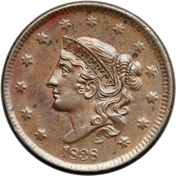 1838 Coronet Head Cent. PCGS graded MS-63 Brown. Frosty light steel brown with lustrous tan and hints of faded mint red in protected areas and a dozen specks of darker olive toning on the obverse. The largest of these olive spots is in the field between star 9 and the hairbun. A couple long, thin nicks near the dentils at star 10 and a dull nick on the rim at star 2 are the only signs of contact. The usual (and only) die state, with both dies heavily worn from earlier marriages. This is the discovery coin and the Wright plate coin for the variety, and is listed as MS60 and tied for finest known honors in the Bland condition census. Noyes photo #36035. Our grade is AU58. Pop 1; 1 in 64 BN. Only 2 graded at PCGS for the variety. DWH #1701 (PCGS # 37222) .