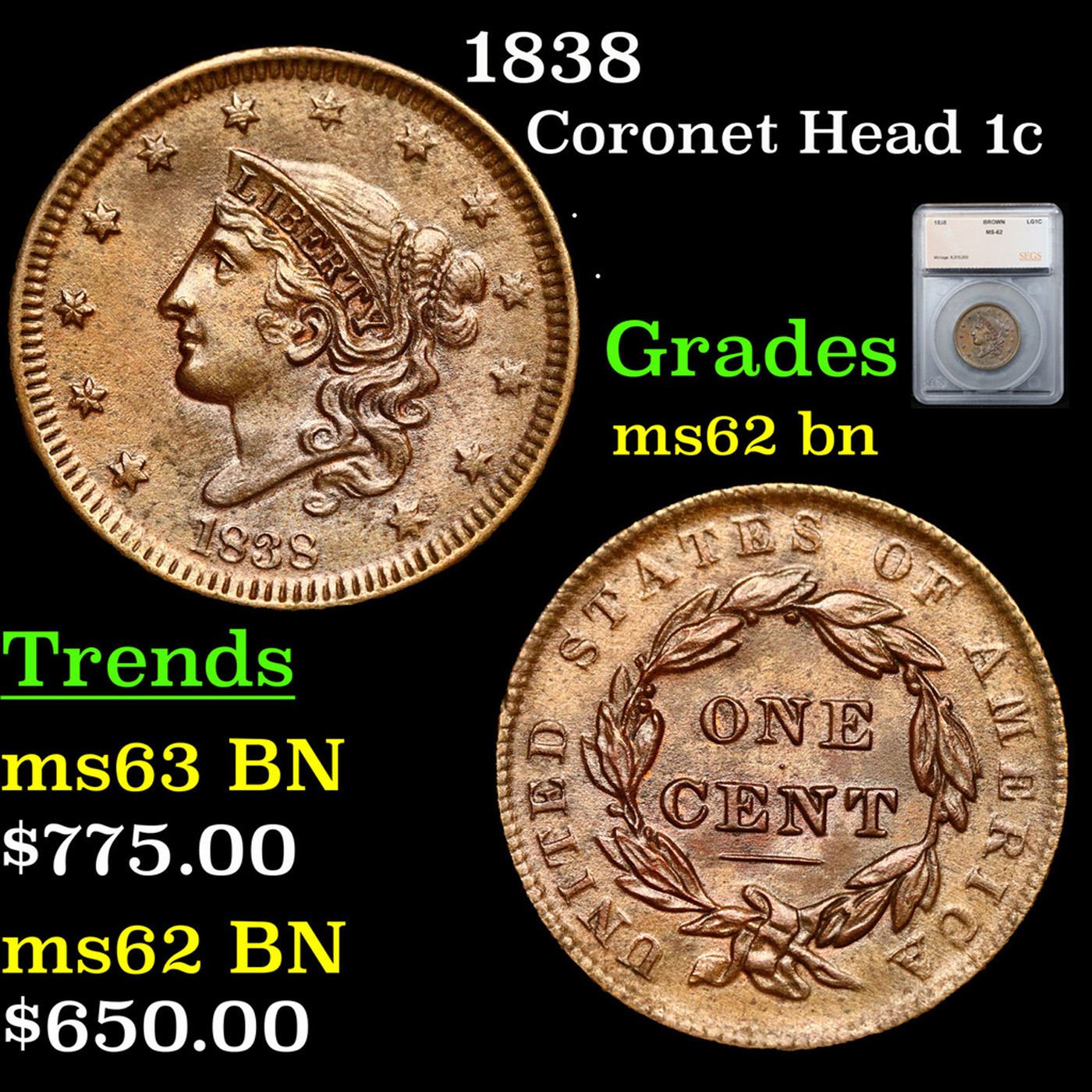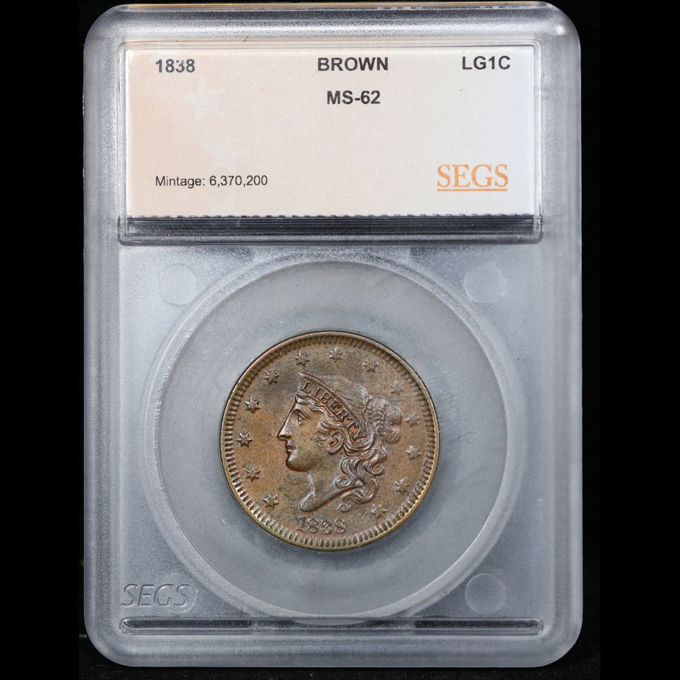 1838 Coronet Head Large Cent 1c Graded ms62 bn By SEGS. A Corey's Pick, Bid to Win Coin