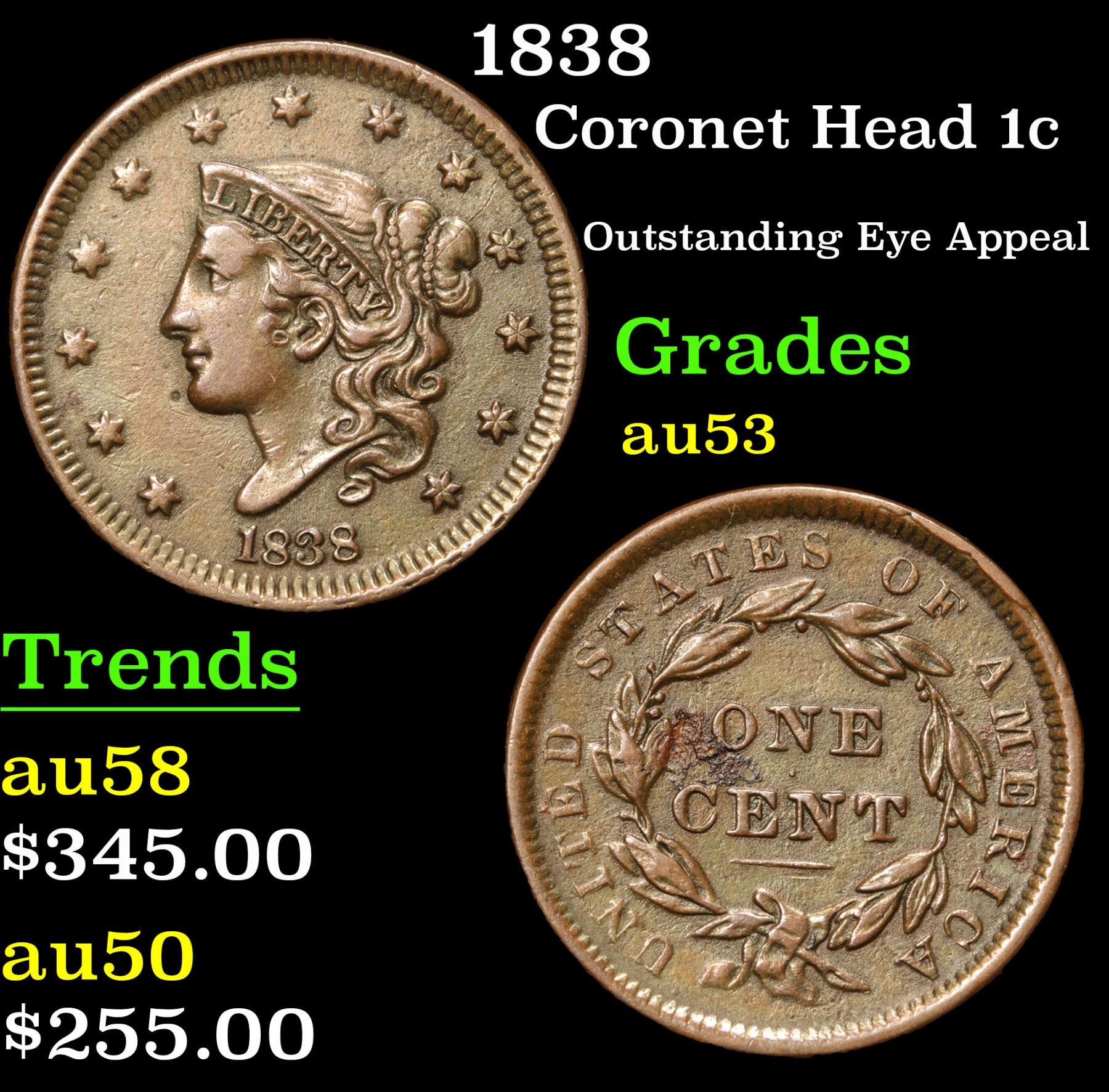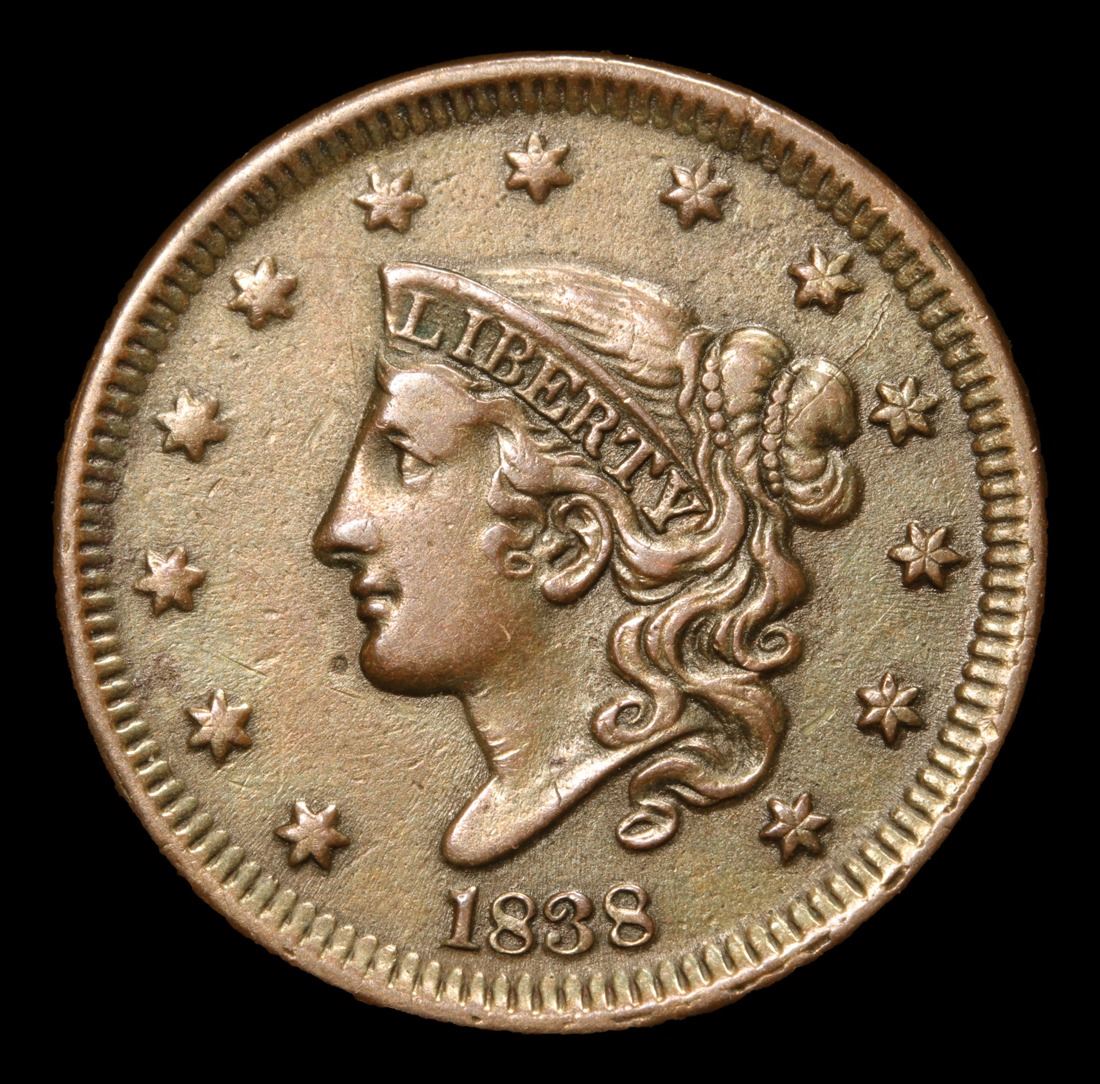 1838 Coronet Head Large Cent 1c Grades Select AU. Outstanding Eye Appeal A Corey's Pick, Bid to Win Coin