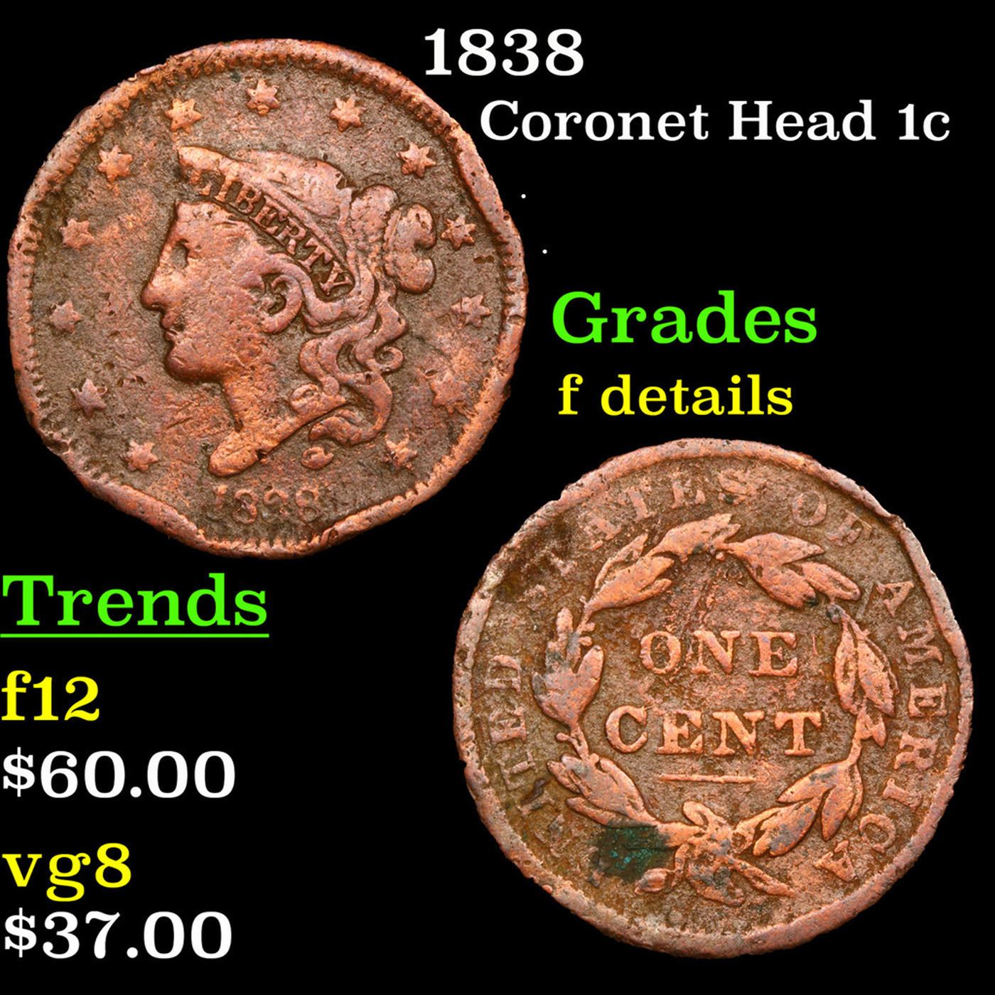 1838 Coronet Head Large Cent 1c Grades f details.