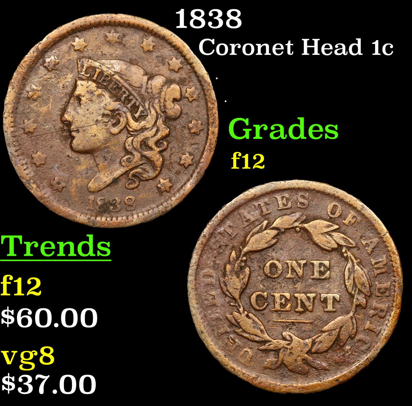 1838 Coronet Head Large Cent 1c Grades f, fine
