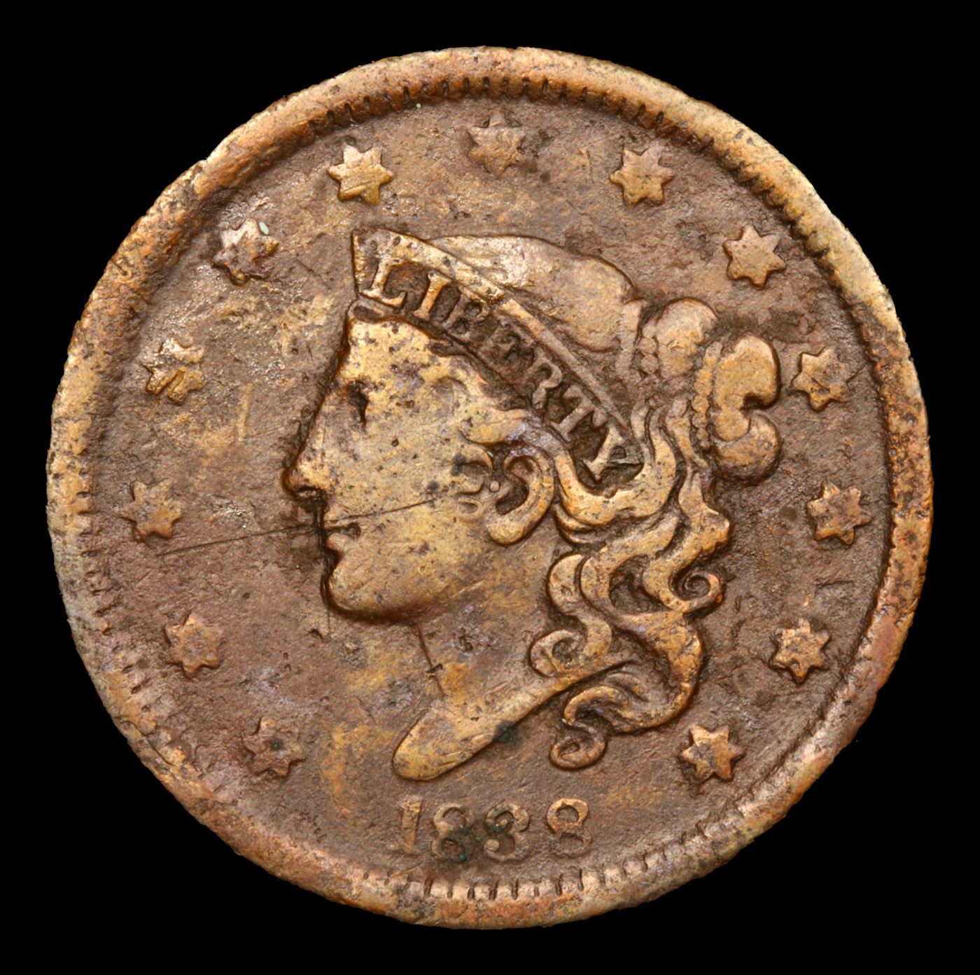 1838 Coronet Head Large Cent 1c Grades f, fine.