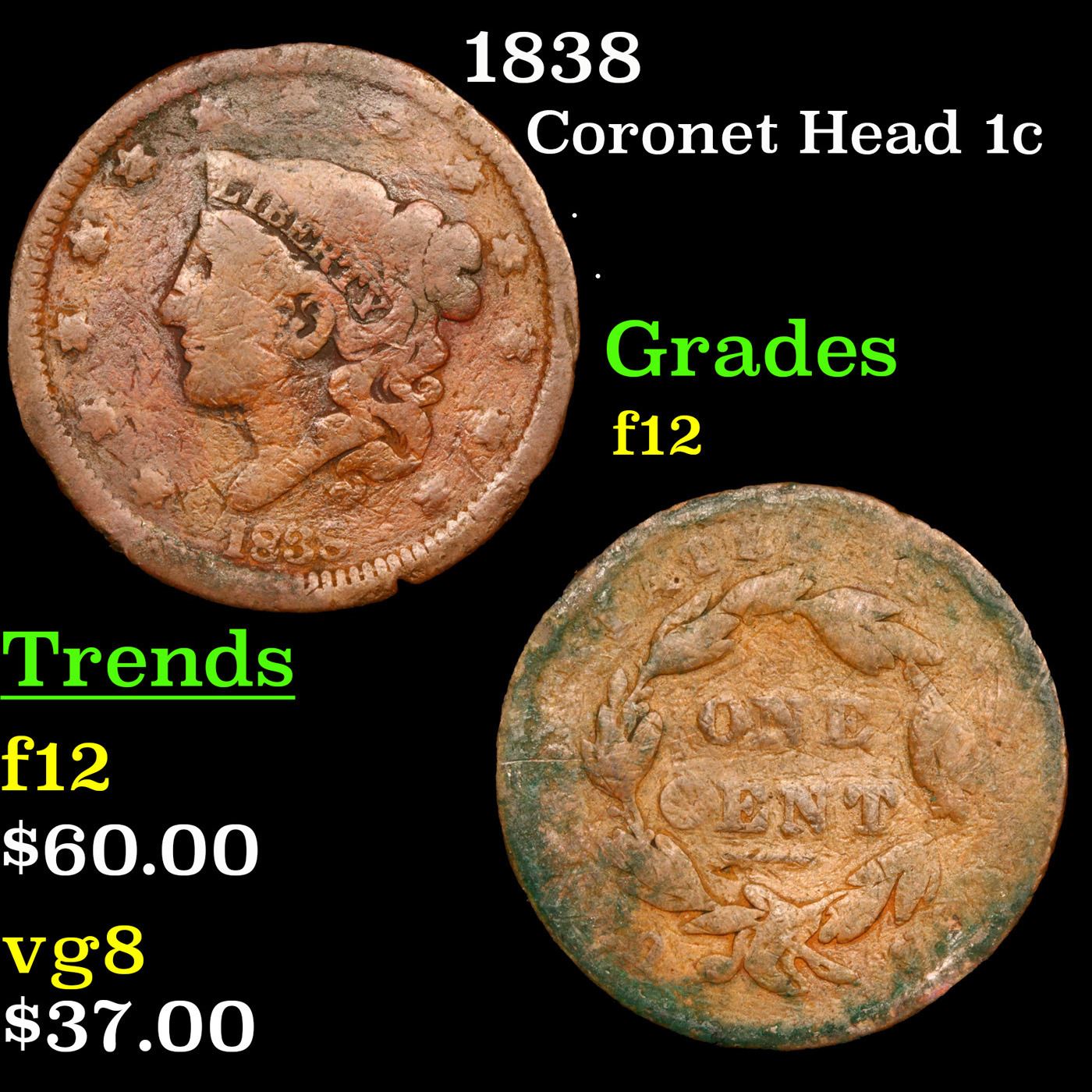 1838 Coronet Head Large Cent 1c Grades f, fine