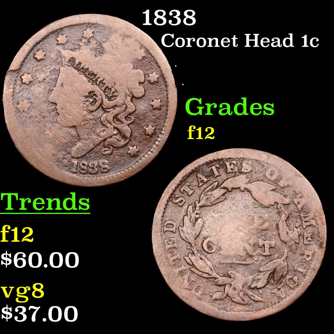 1838 Coronet Head Large Cent 1c Grades f, fine