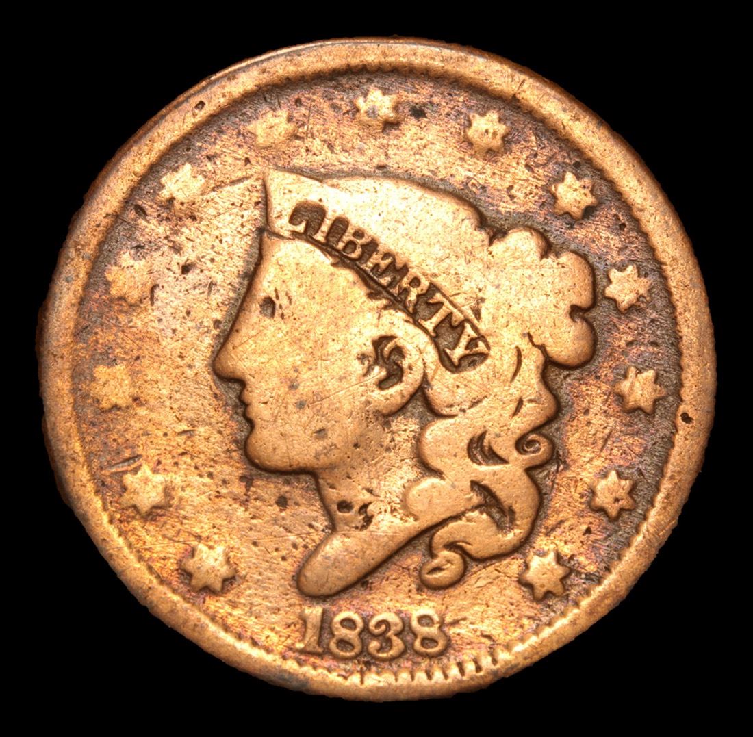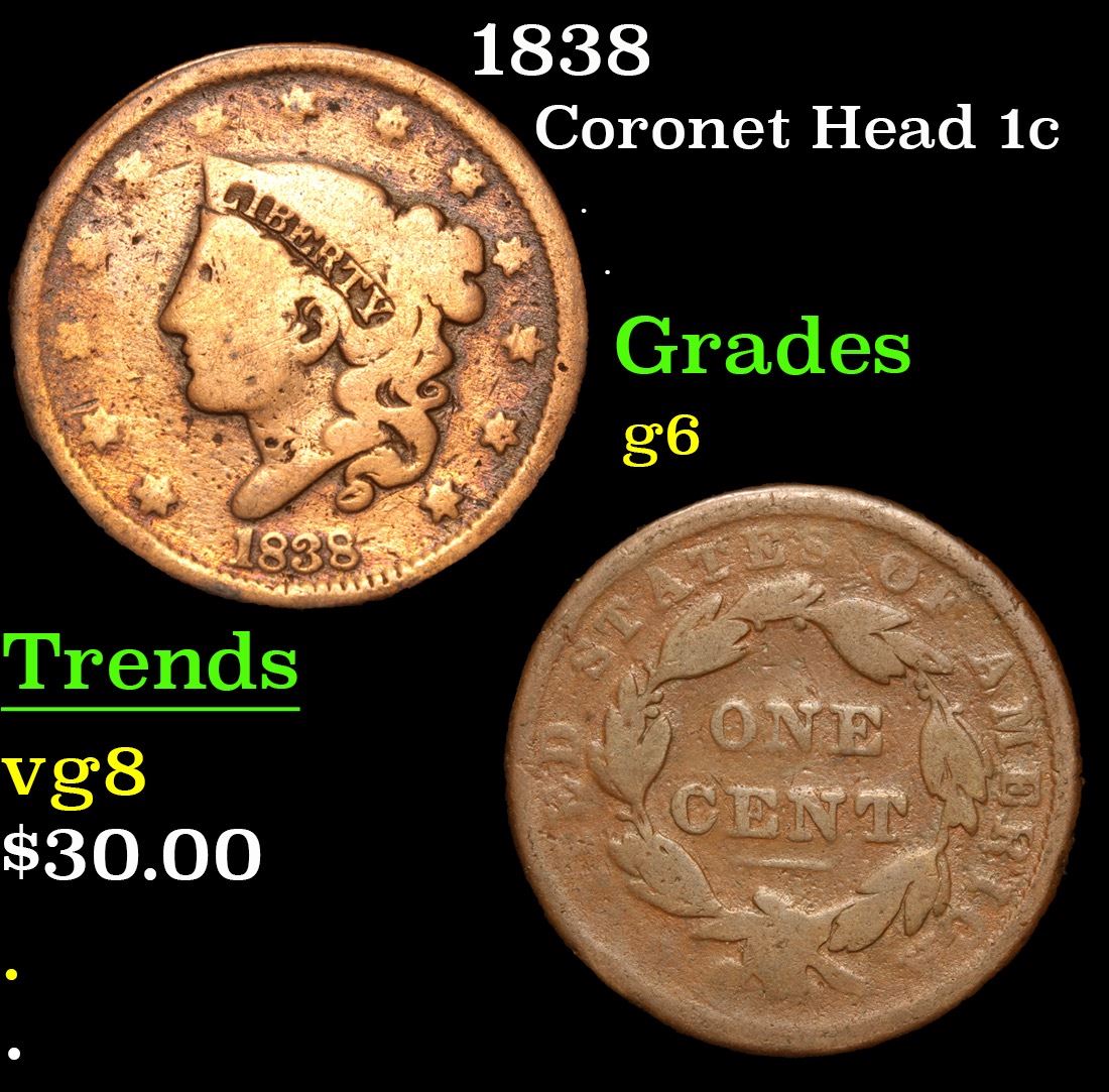 1838 . . Coronet Head Large Cent 1c Grades g+.
