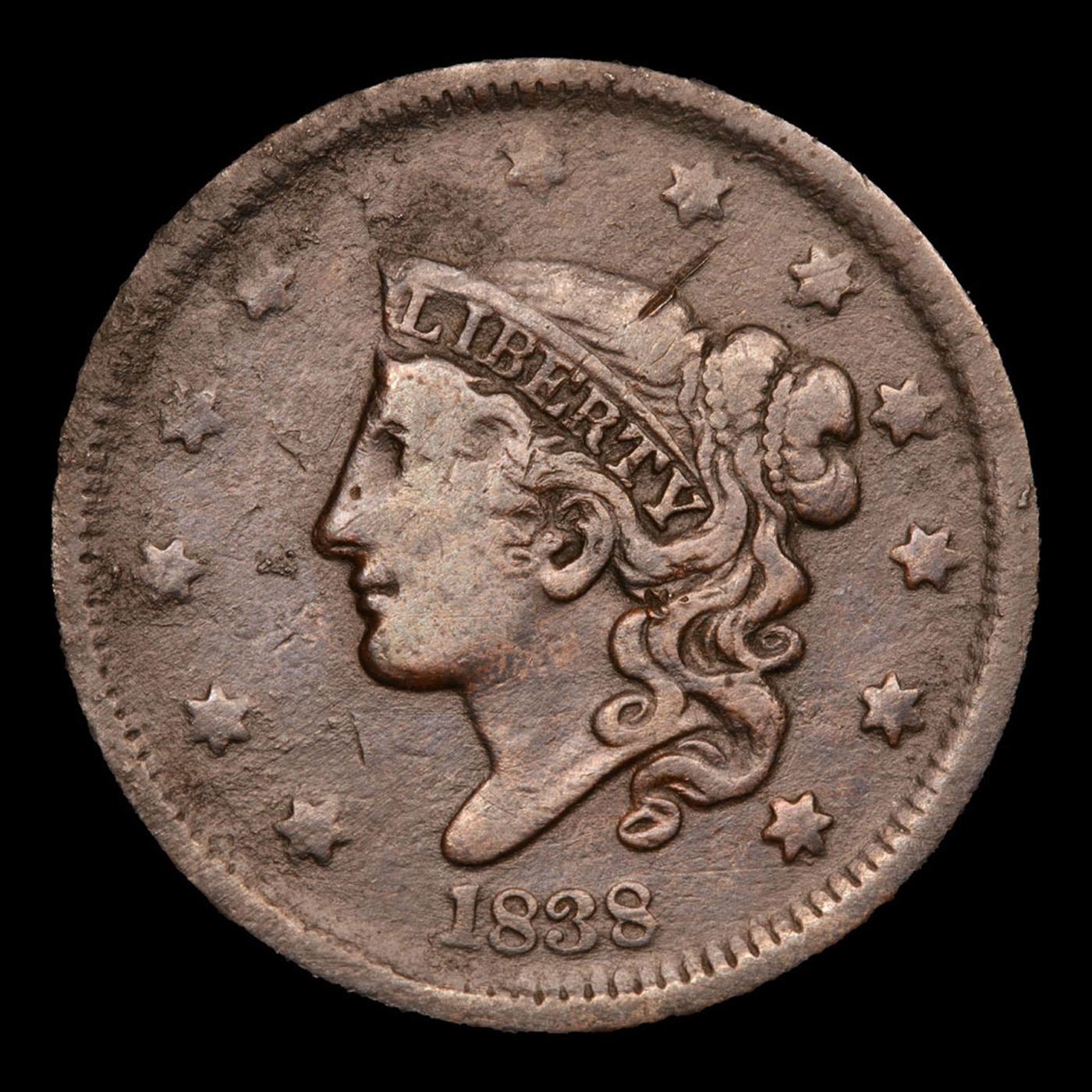 1838 Coronet Head Large Cent 1c Grades vf details.