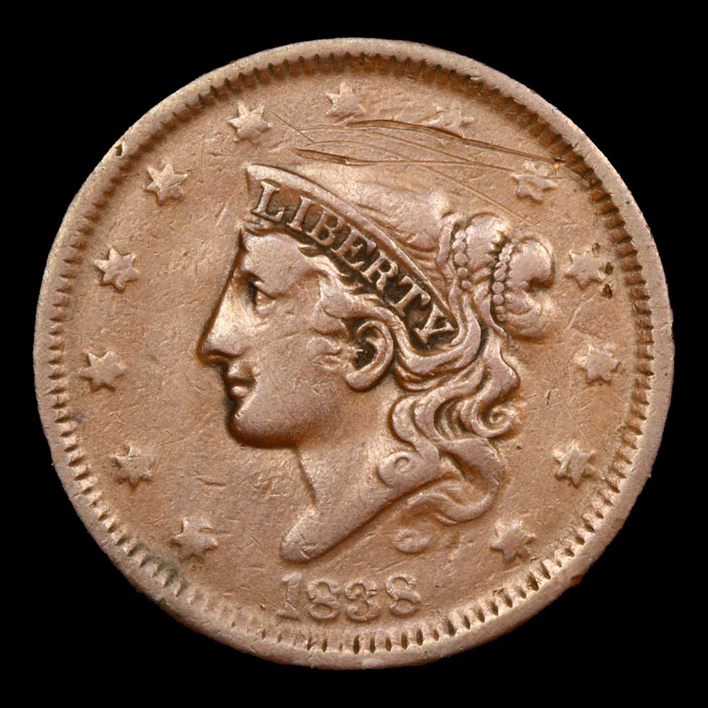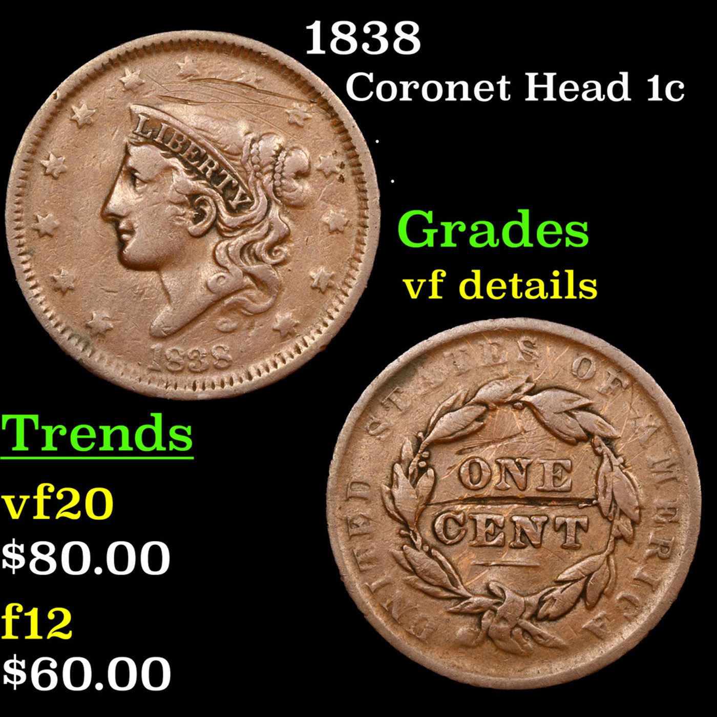 1838 Coronet Head Large Cent 1c Grades vf details.
