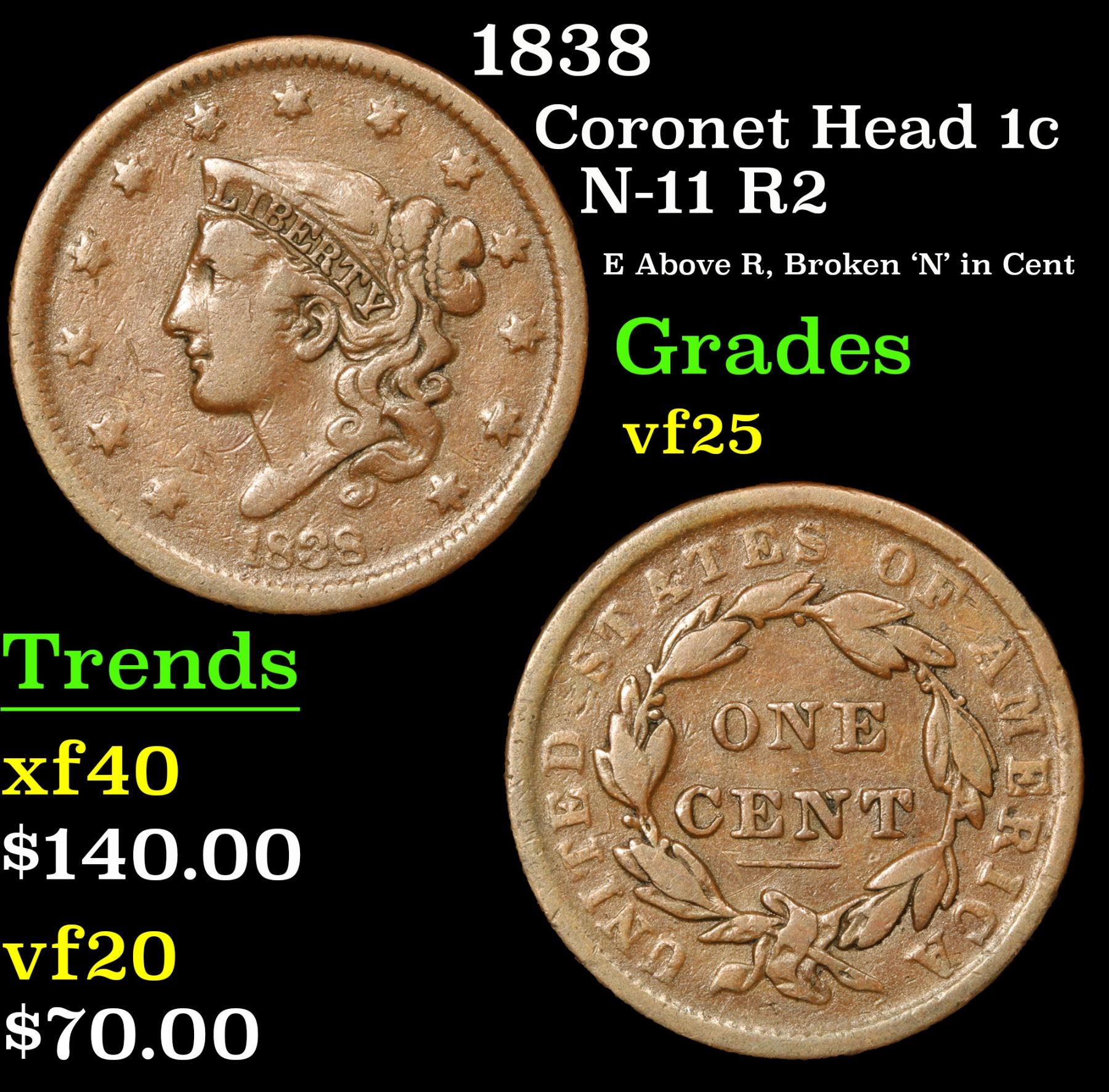 1838 Coronet Head Large Cent 1c Grades vf+. N-11 R2; E Above R, Broken 'N' in Cent