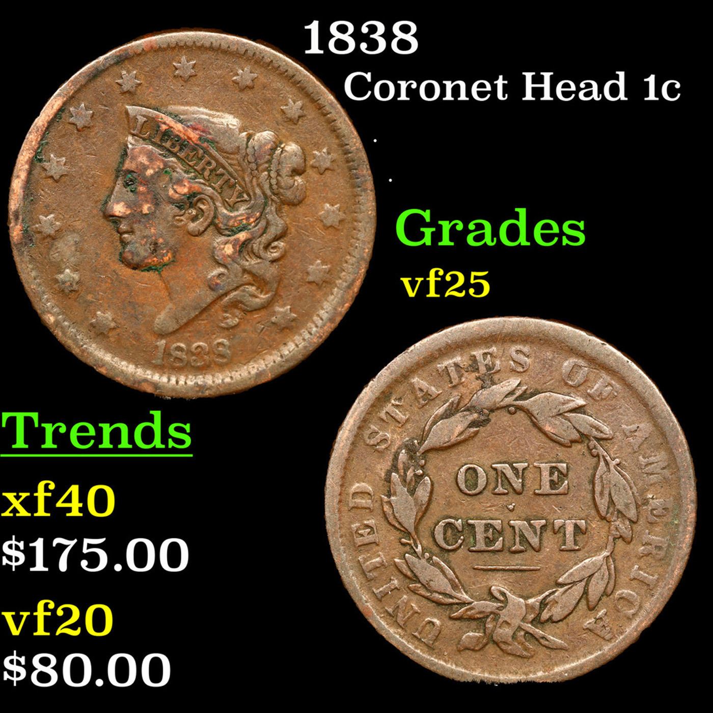 1838 Coronet Head Large Cent 1c Grades vf+.