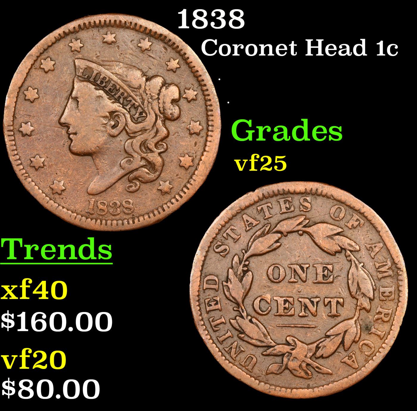 1838 Coronet Head Large Cent 1c Grades vf+.