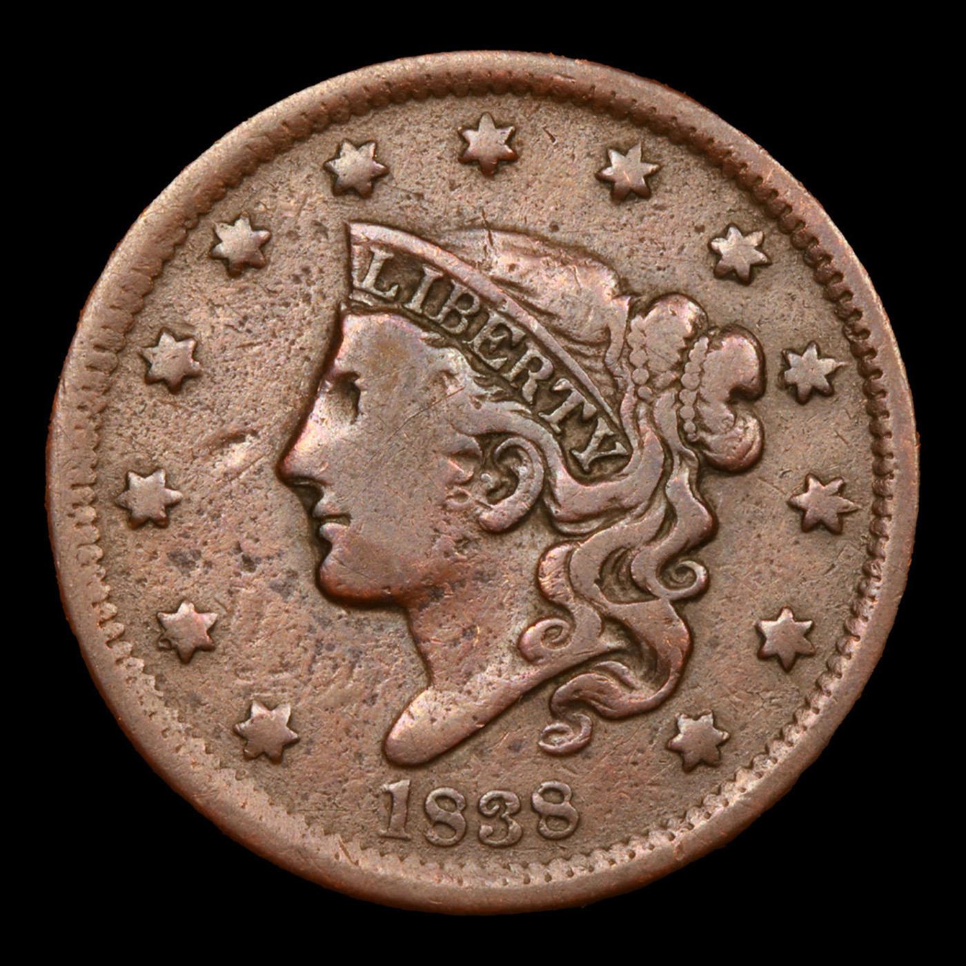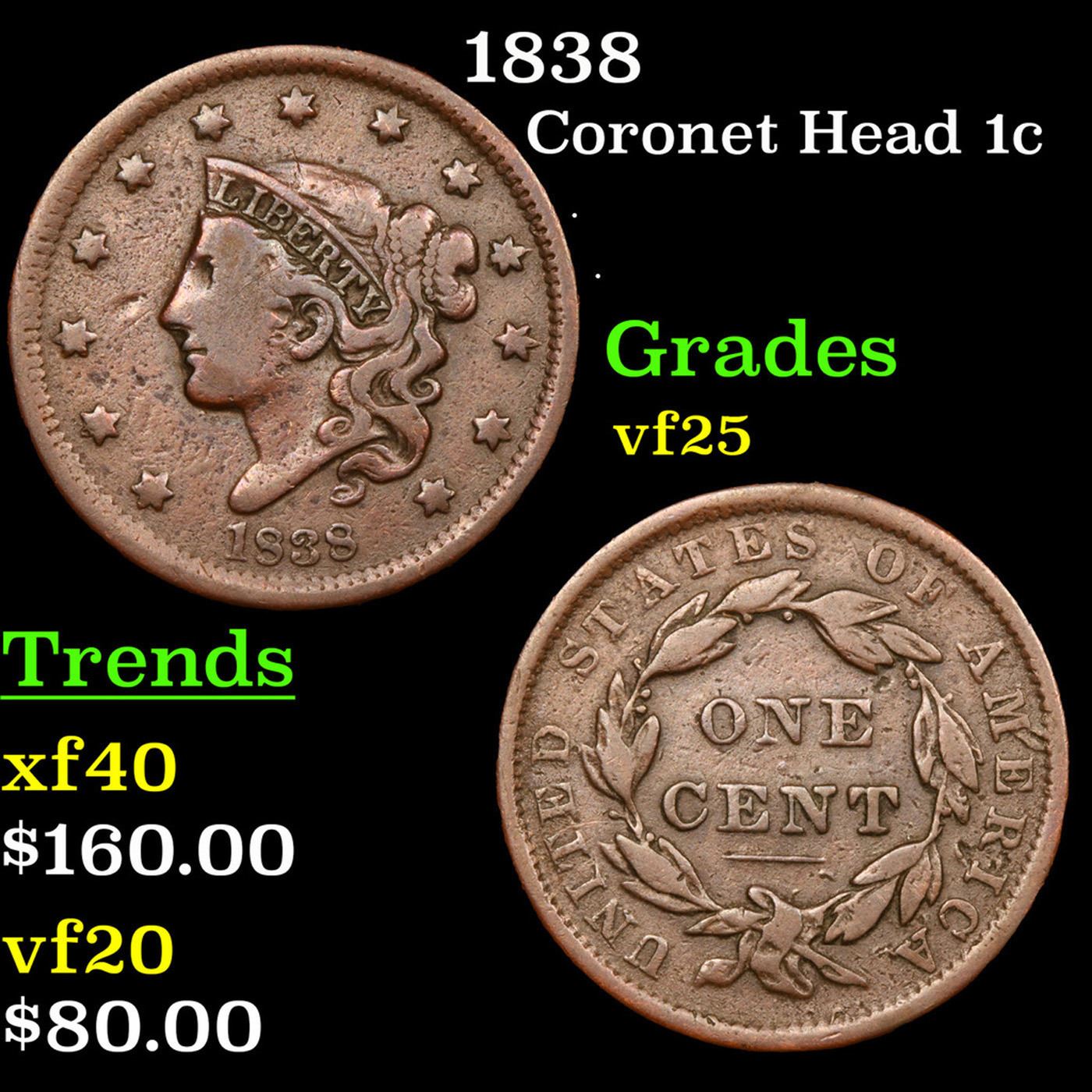 1838 Coronet Head Large Cent 1c Grades vf+.