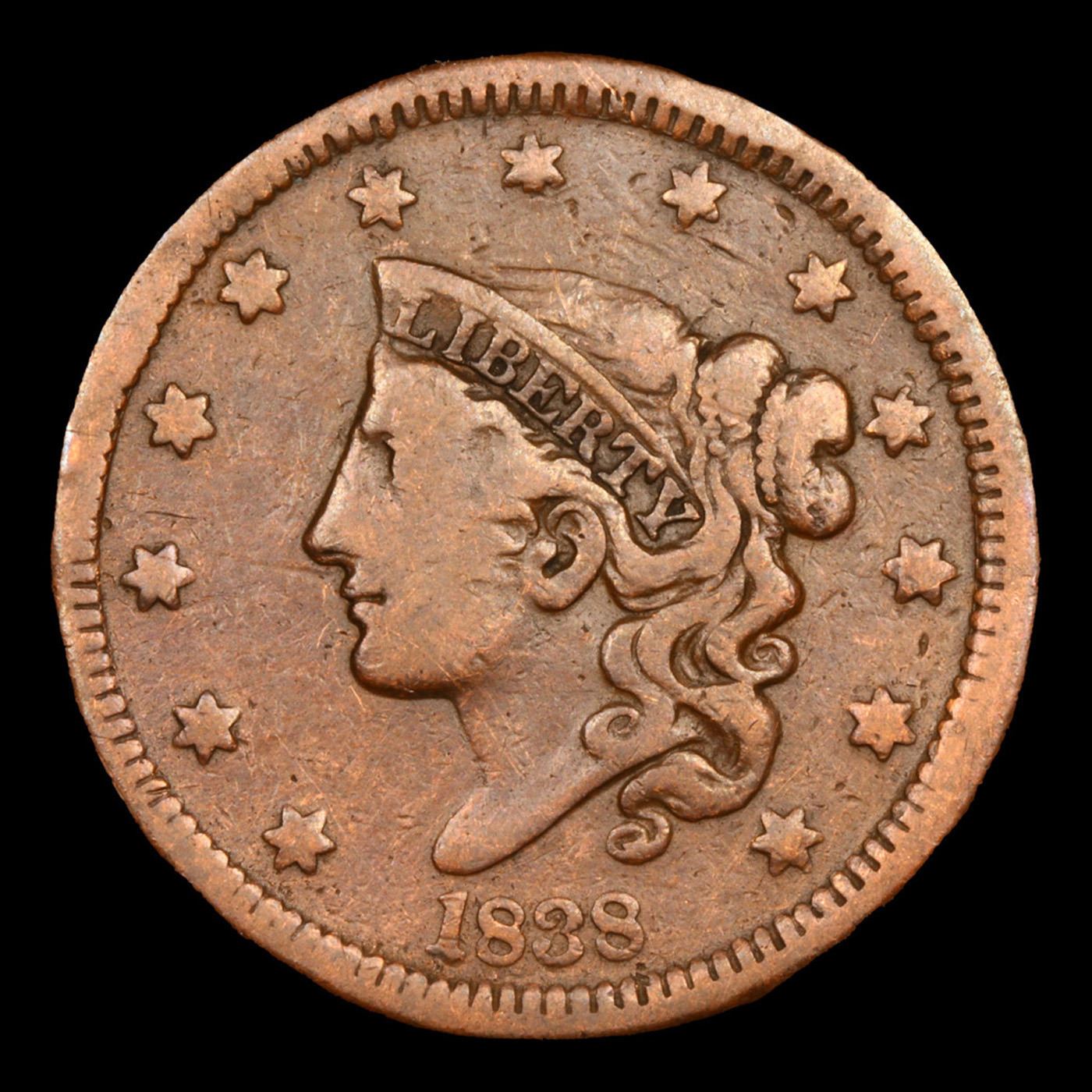1838 Coronet Head Large Cent 1c Grades vf+.
