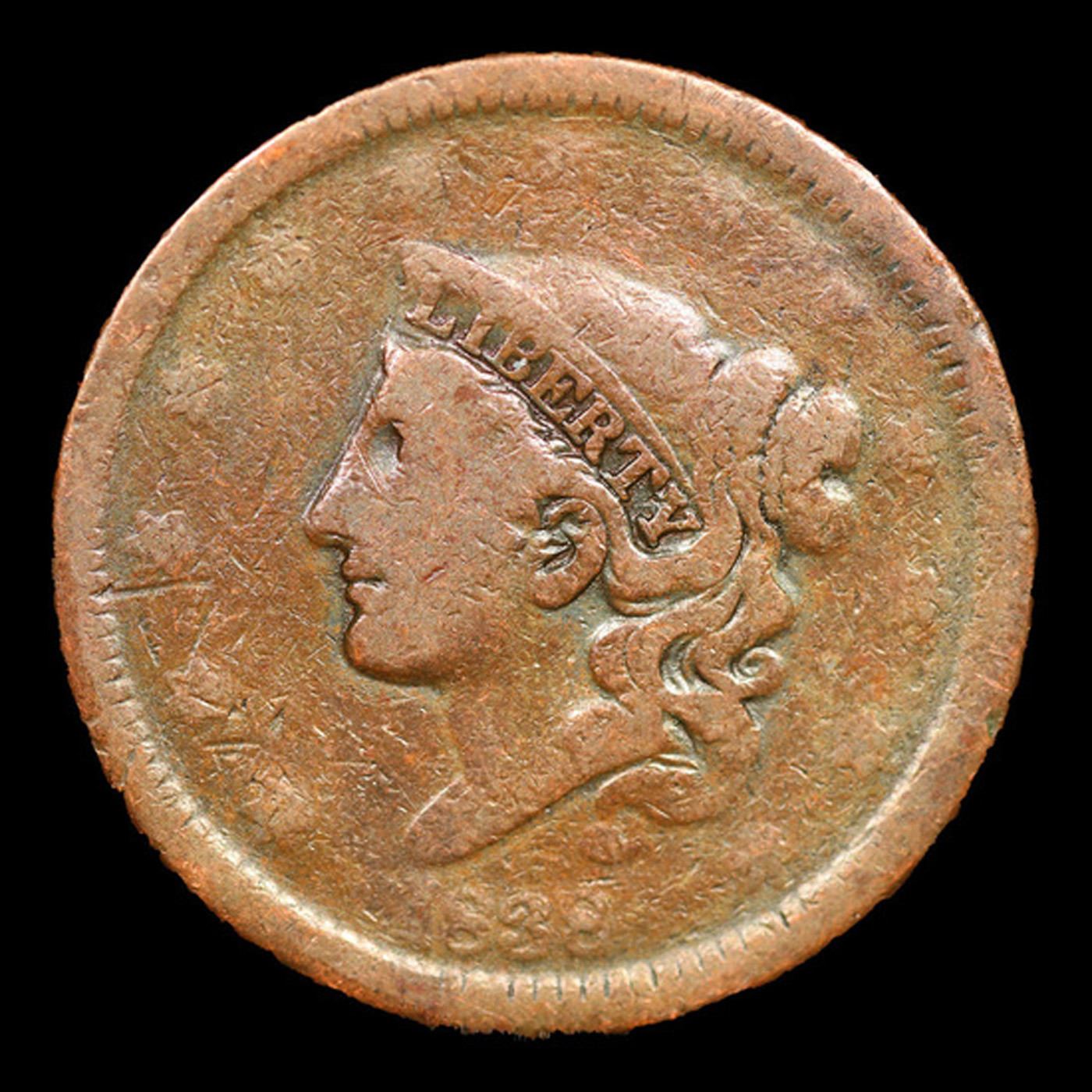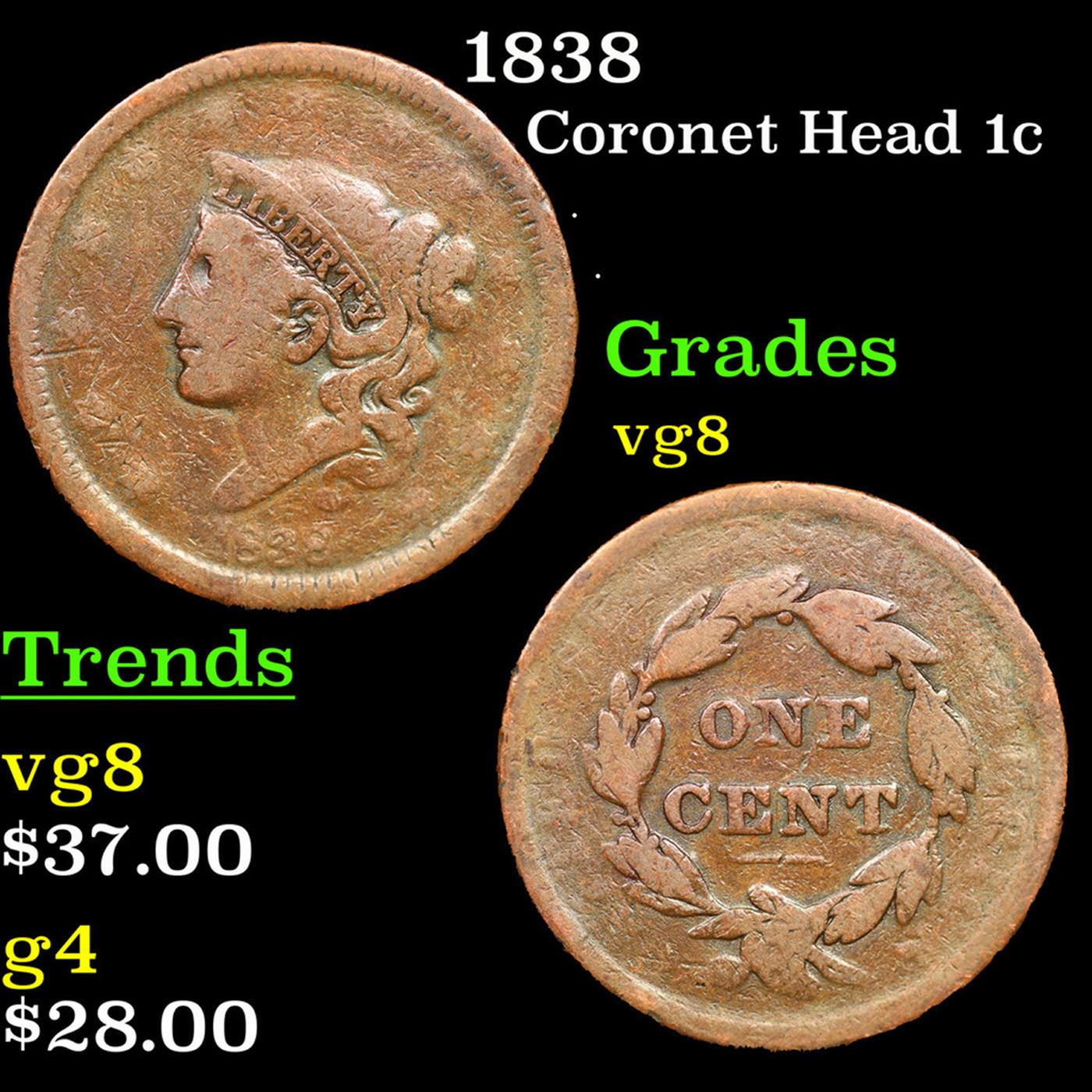 1838 Coronet Head Large Cent 1c Grades vg, very good.