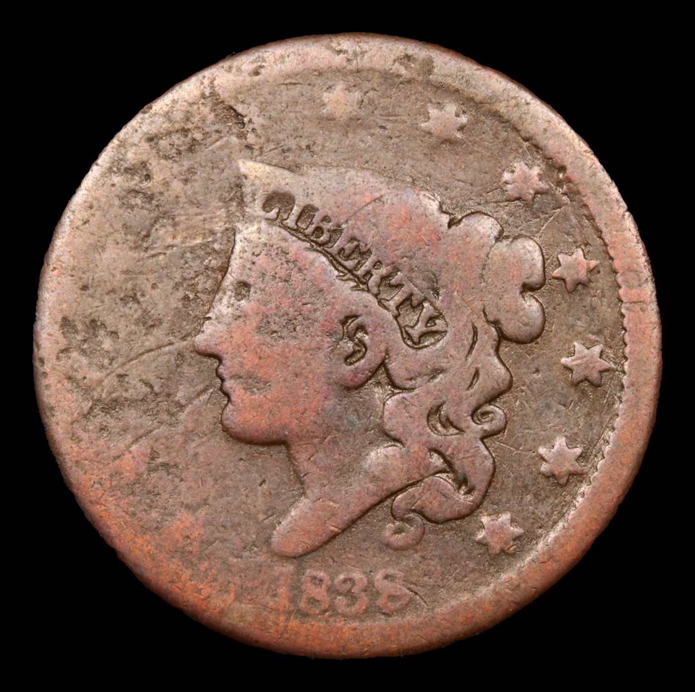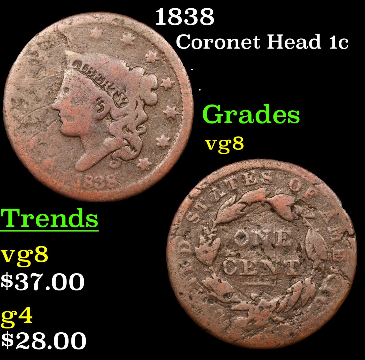 1838 Coronet Head Large Cent 1c Grades vg, very good.