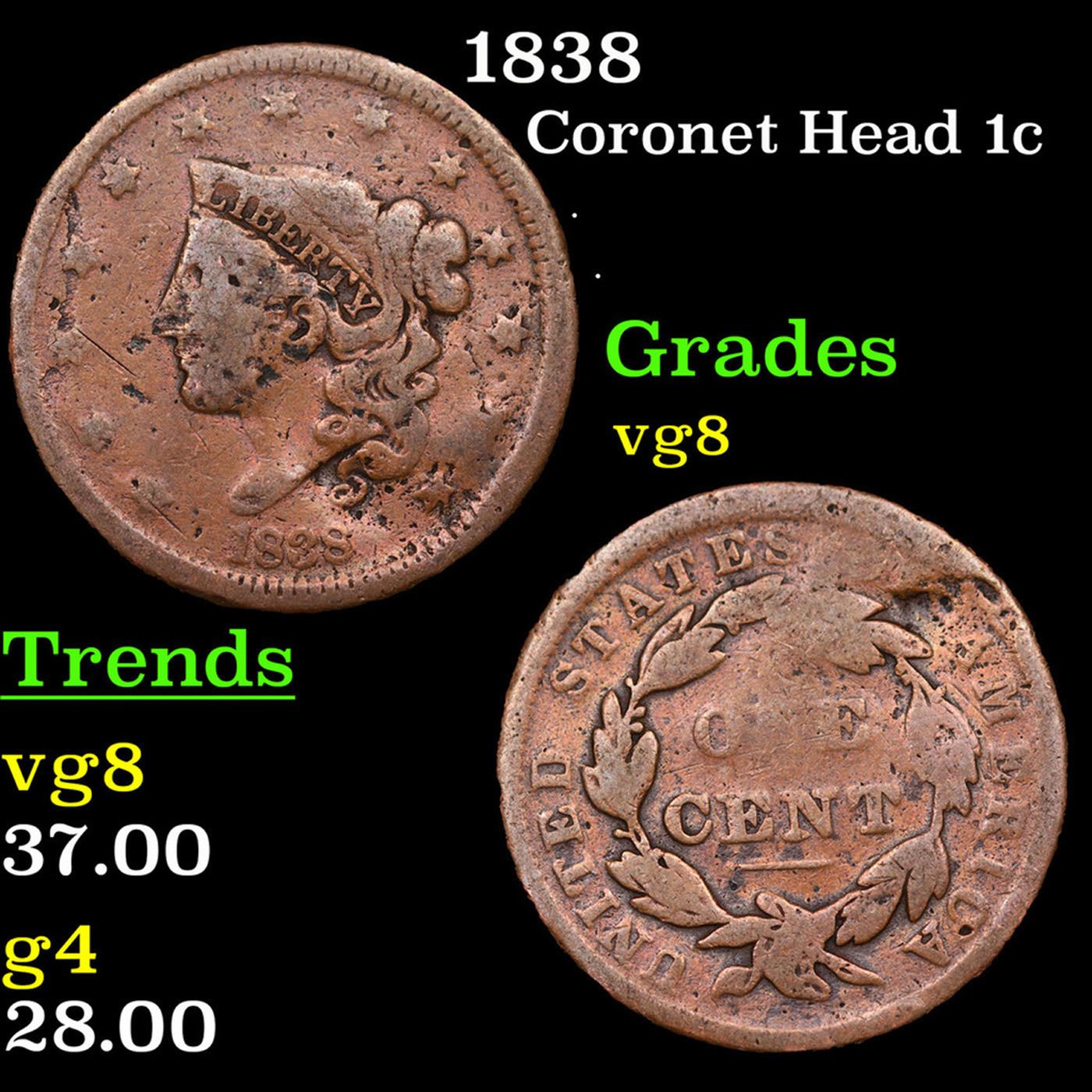 1838 Coronet Head Large Cent 1c Grades vg, very good.