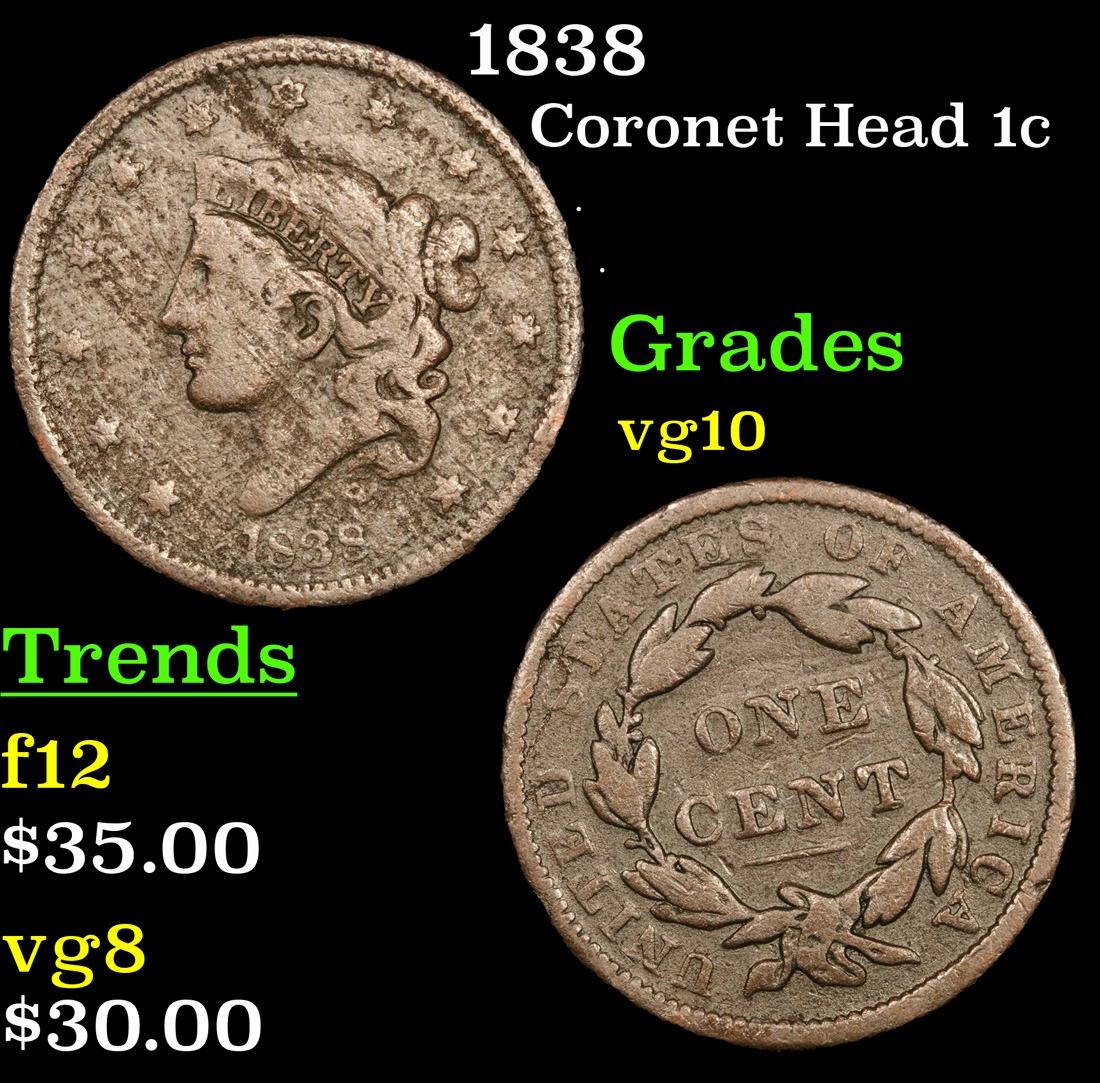 1838 . . Coronet Head Large Cent 1c Grades vg+.