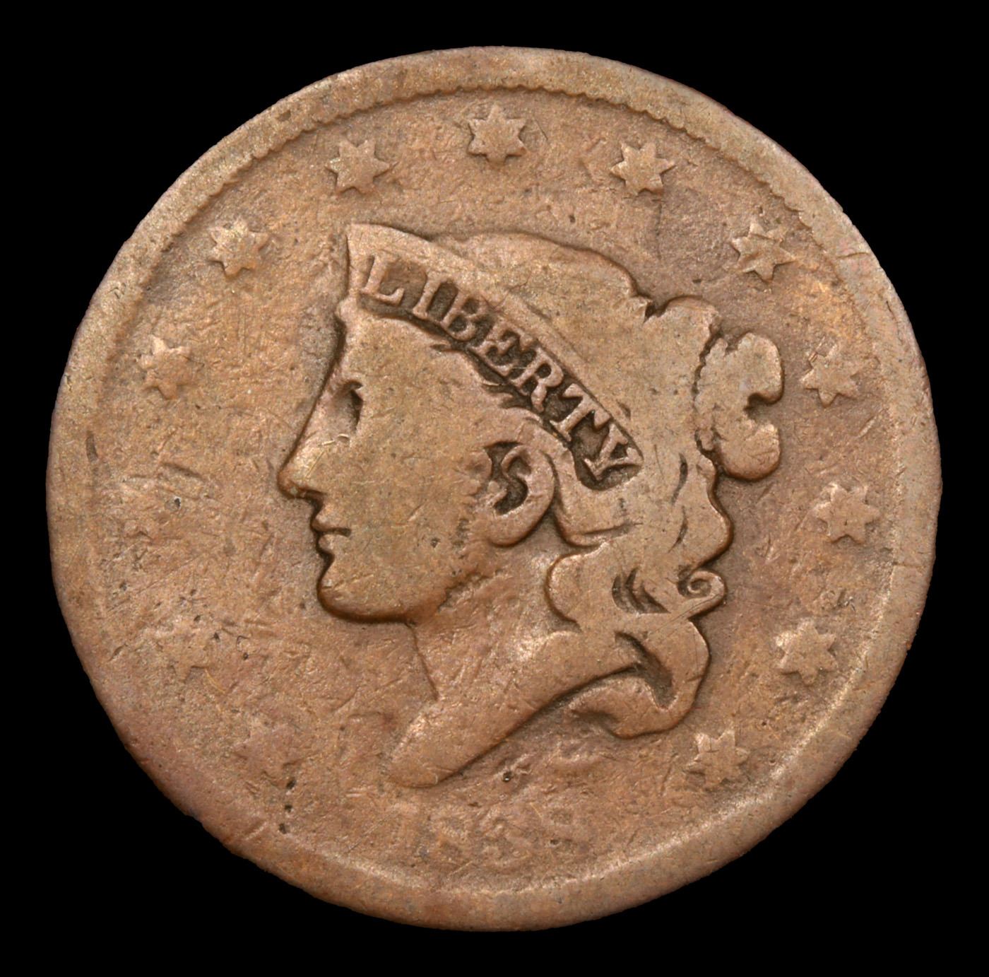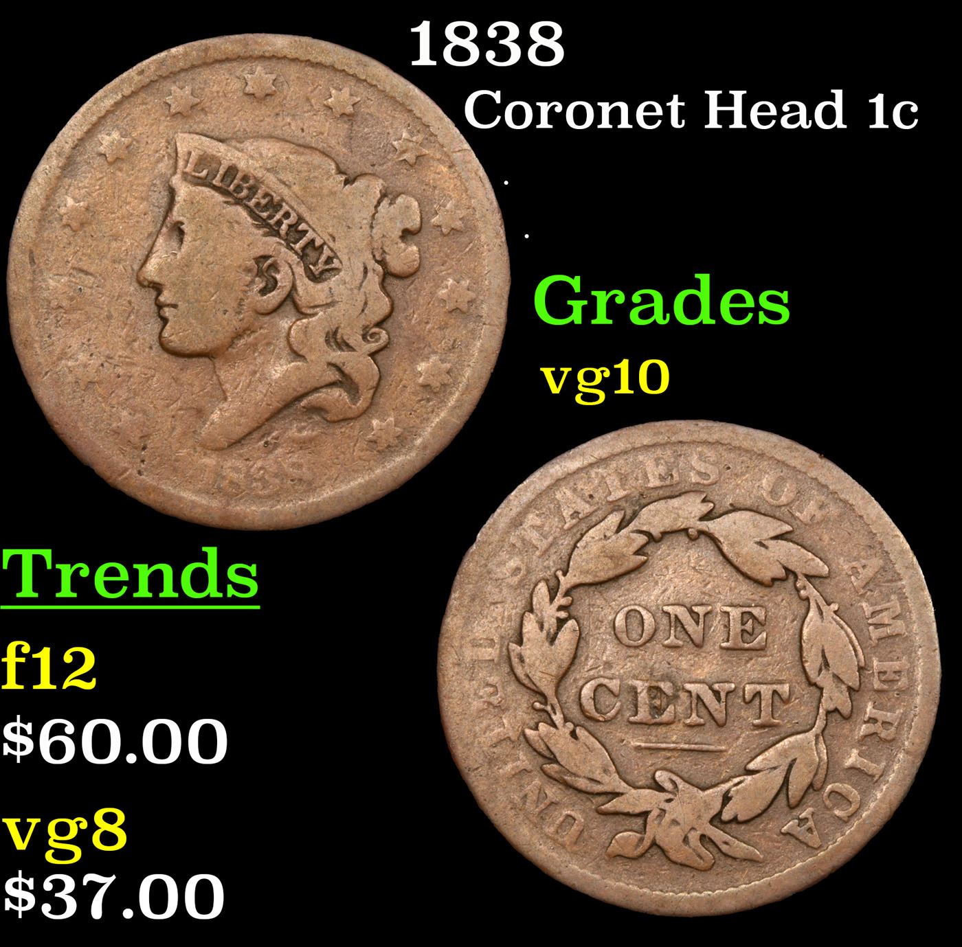 1838 Coronet Head Large Cent 1c Grades vg+.