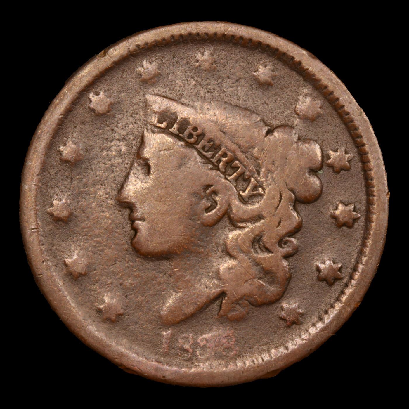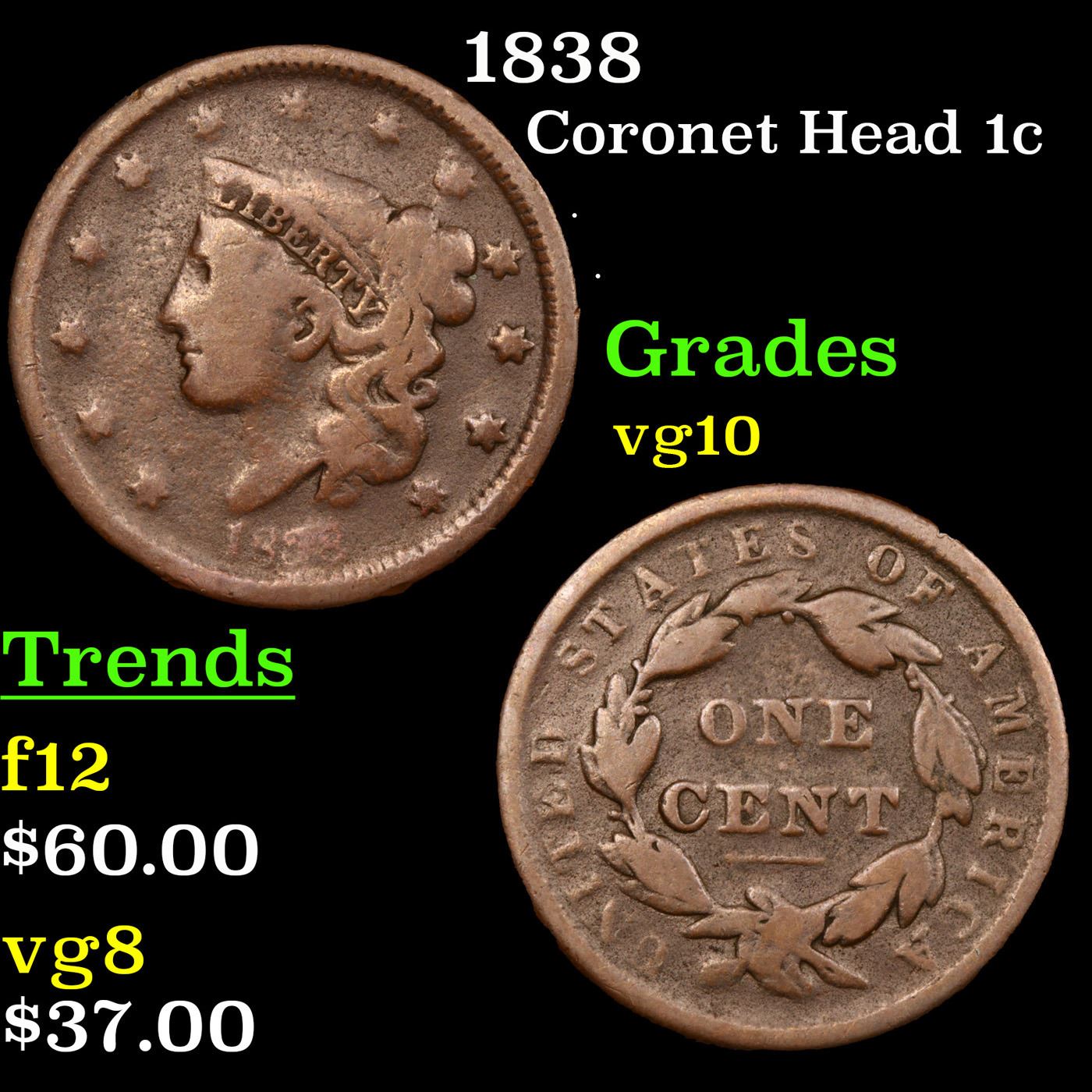 1838 Coronet Head Large Cent 1c Grades vg+.