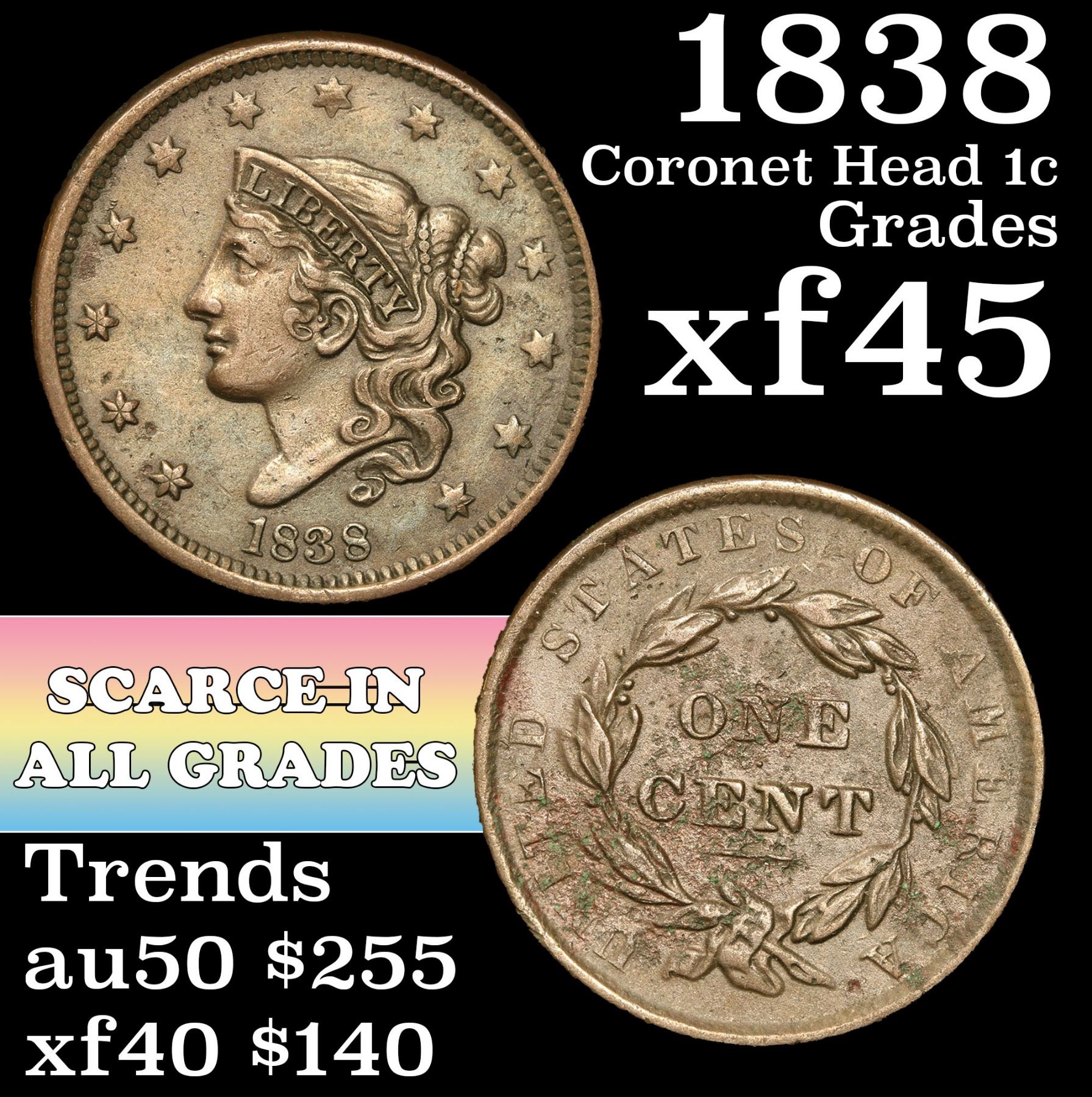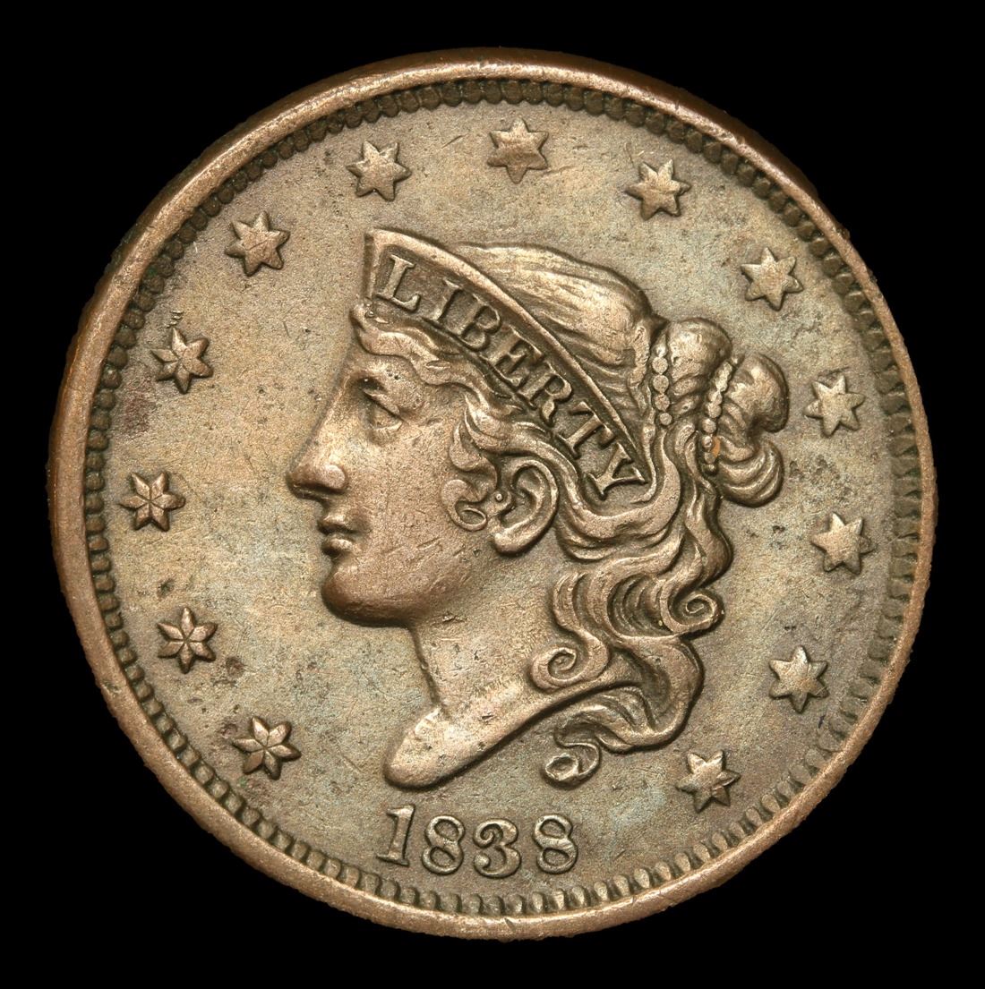 1838 Coronet Head Large Cent 1c Grades xf+.