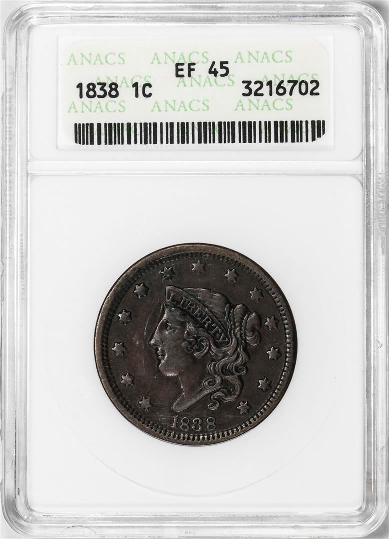 One 1838 Coronet Head Large Cent Coin ANACS EF45. ANACS Certified.