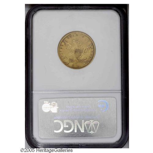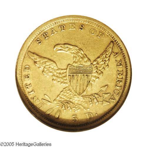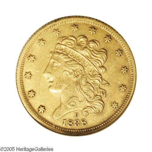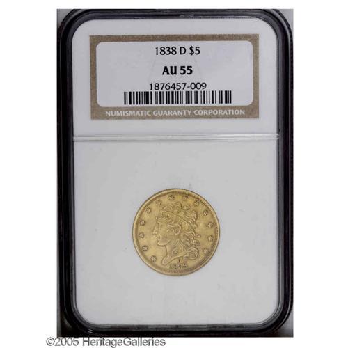 <B>1838-D<$5> AU55 NGC.</B></I> Variety 1-A, McCloskey 1-A, R.3. While the '38-D is generally available relative to other Dahlonega Five Dollar issues, and in a wide range of circulated grades, a high grade coin is indeed very special and highly desirable. Each side of this specimen is somewhat subdued, with medium antique-gold color and only minimal scuffiness in the fields. The strike is unusually bold with strong, clear definition on the hair curls over the ear and bold details on the eagle's plumage. We note a couple of light marks overall, but these are of little consequence when one considers the overall eye appeal of this first-year Dahlonega Five.