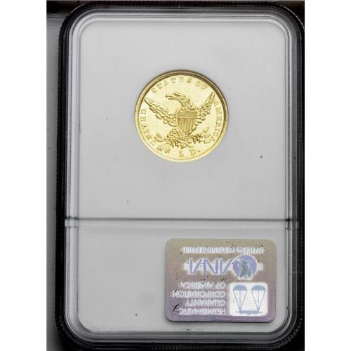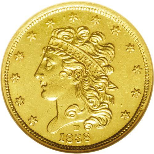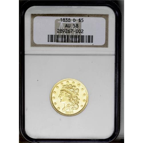 <B>1838-D<$5> AU58 NGC.</B></I> McCloskey 1-A, R.3. The discovery of gold in the North Georgia mountains was really more of a gradual recognition that the region contained significant amounts of gold. Spanish explorer Hernando de Soto visited the region in the early 1540s to seek gold. Evidence exists that Indians panned for gold in the early 1800s. As early as 1819, white fortune-seekers panned for gold near the Cherokee town of Sixes. The first official mining operations date from 1828 or '29. By 1830, the region was producing several hundred ounces of gold a day, and Auraria (Latin for "city of gold"), just south of Dahlonega, became a boomtown almost overnight. The gold discoveries--most of them on Cherokee land--culminate in the Trail of Tears, the forced march of the Cherokee Nation to Oklahoma, some 1,000 miles away, during the fall and brutal winter of 1838-39.<BR> The branch mints established in Charlotte and Dahlonega were strictly devoted to the production of gold coins for local circulation. And indeed, most of the C- and D-mint coins did circulate widely, so that some of these mintmarked pieces are unknown, or nearly so, in Mint State. The present issue is a case in point. Although NGC has graded more than 100 pieces of this issue, the vast majority are AU58 or below. This piece has attractive greenish-gold surfaces, with much luster remaining, and minimal, grade-consistent light abrasions. A popular issue, both for the Classic Head design and the obverse mintmark. Census: 19 in 58, 16 finer (7/06).