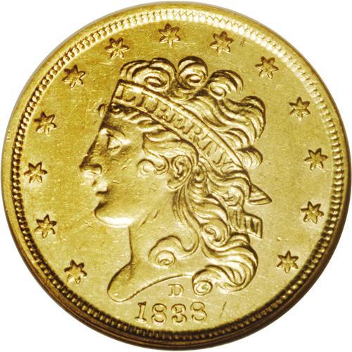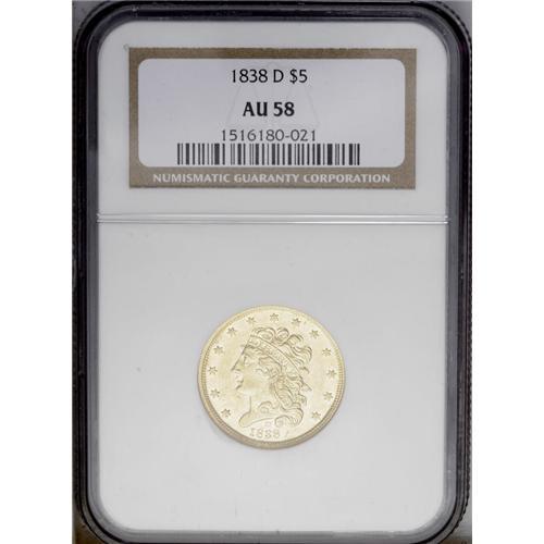 <B>1838-D<$5> AU58 NGC.</B></I> McCloskey 1-A, R.3. A single pair of dies was used to produce the 1838-D issue, and is available in VF and XF grades, as well as in the lower ranges of AU. It becomes scarce in high-end AU and quite rare in Mint State grades. NGC and PCGS have certified fewer than 40 AU58s, the level of preservation of the present piece, and less than 20 Uncirculated coins.<BR> Bright gold surfaces display traces of luster in the recessed areas. Sharp definition is noted on the design elements, though some of the star centers are soft. Several light contact marks, and some wispy slide marks, occur over each side. Overall, a pleasing classic Head five dollar.