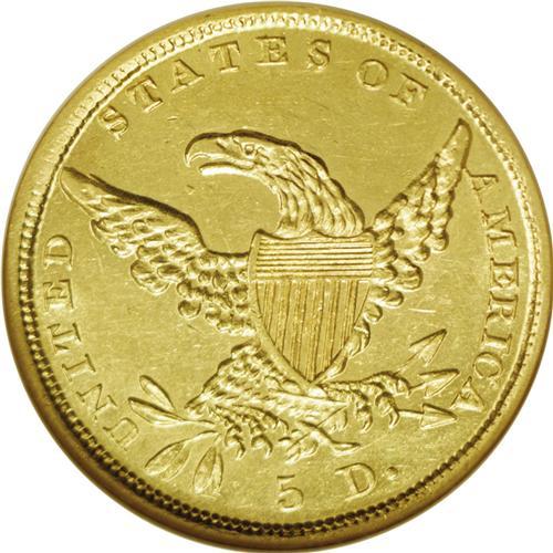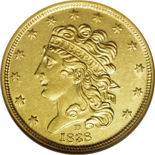 <B>1838-D<$5> MS60 NGC.</B></I> Variety 1-A, McCloskey 1-A, R.3. While the '38-D is generally available relative to other Dahlonega five dollar issues, and in a wide range of circulated grades, a strict Uncirculated coin is indeed very special and highly desirable. Each side of this specimen is bright and flashy, with light to medium green-gold color and only modest scuffiness in the fields, perhaps heightened by the scintillating luster. The strike is unusually bold with strong, clear definition on the hair curls over the ear and bold details on the eagle's plumage. A solitary diagonal slide mark appears on the cheek when viewed from selected angles, but this is of little consequence when one considers the overall eye appeal of this first-year Dahlonega five. Census: 3 in 60, 10 finer (2/06).