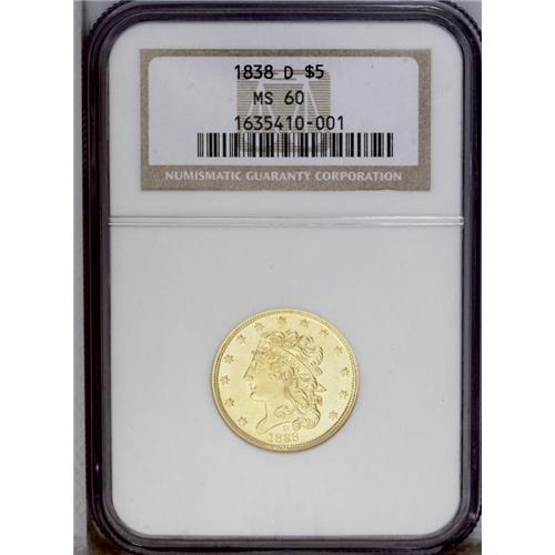 "1838-D $5 MS60 NGC. Variety 1-A, McClos"
