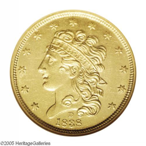 <B>1838-D<$5> MS60 NGC.</B></I> Variety 1-A, McCloskey 1-A, R.3. While the '38-D is generally available relative to other Dahlonega five dollar issues, and in a wide range of circulated grades, a strict Uncirculated coin is indeed very special and highly desirable. Each side of this specimen is bright and flashy, with light to medium green-gold color and only modest scuffiness in the fields, perhaps heightened by the scintillating luster. The strike is unusually bold with strong, clear definition on the hair curls over the ear and bold details on the eagle's plumage. We note a couple of light marks overall, but these are of little consequence when one considers the overall eye appeal of this first-year Dahlonega five. Census: 3 in 60, 9 finer (10/05).<BR><I>From The Frank Manthey Collection of Gold Coins.</B></I>