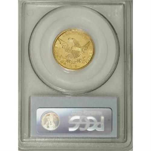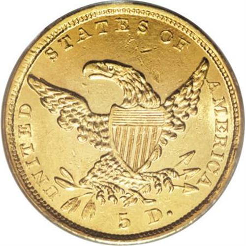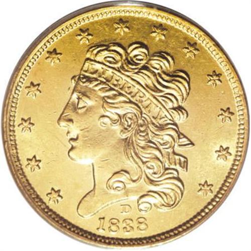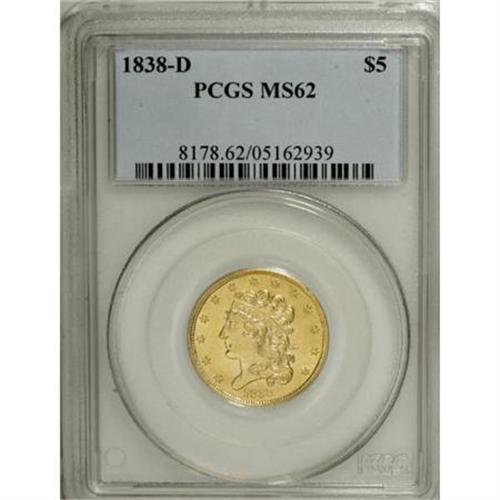 <B>1838-D $5 MS62 PCGS.</B></I> McCloskey 1-A, Variety 1-A, R.3. The 20,583 half eagles of this first-year issue, coined from a single die pair, are the only Classic Head half eagles minted at Dahlonega, and as such, they are popular with a broad cross-section of collectors. On the cover of the second edition of <I>Gold Coins of the Dahlonega Mint</B></I>, Douglas Winter placed an image of the Classic Head profile and a D mintmark underneath, a tribute to the design that appeared on the first coins issued from the Dahlonega Mint.<BR> This solidly impressed representative has shining canary-gold surfaces with glints of green and orange in the lightly clashed obverse fields. Scattered marks and a thin abrasion to the left of Liberty's lips deny a Select designation. Nonetheless, this is an attractive example, easily one of the finest known representatives of this in-demand issue. Struck from a heavily polished obverse die that has part of Liberty's forelock and the stems of the olive leaves missing. Population: 5 in 62, 1 finer (7/07).<BR><BR><B>Coin Engraver:</B> William Kneass<BR><BR><b>Shipping:</b> Coins & Currency (<a target="_blank" href="http://www.heritageauctions.com/common/shipping.php">view shipping information</a>\)