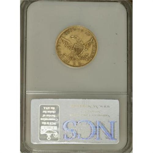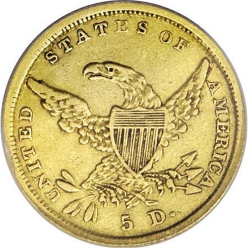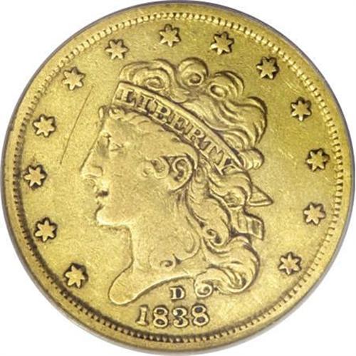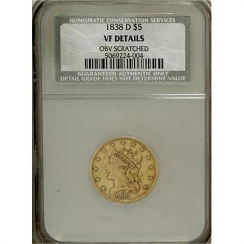 <B>1838-D $5 --Obverse Scratched--NCS. VF Details.</B></I> McCloskey 1-A. Only a single die pair was used to strike the first Dahlonega Mint half eagle issue. Just 20,583 pieces were struck, and only a tiny fraction of that emission has survived. This original olive-gold example has a straight pinscratch in the field near stars 3 to 5, but is otherwise attractive for the VF level.<BR><BR><B>Coin Engraver:</B> William Kneass<BR><BR><b>Shipping:</b> Coins & Currency (<a target="_blank" href="http://www.heritageauctions.com/common/shipping.php">view shipping information</a>)