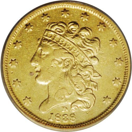 <B>1838-D<$5> XF45 ICG.</B></I> McCloskey 1-A, R.3, the only dies. A scant 20,583 pieces were struck for this important issue. The 1838-D is the sole Classic half eagle from Dahlonega, and it is also important as the first gold issue produced by the fledgling branch mint. This lightly worn tan-gold piece has a small spot in the field near Liberty's mouth, but abrasions are insubstantial for the grade.